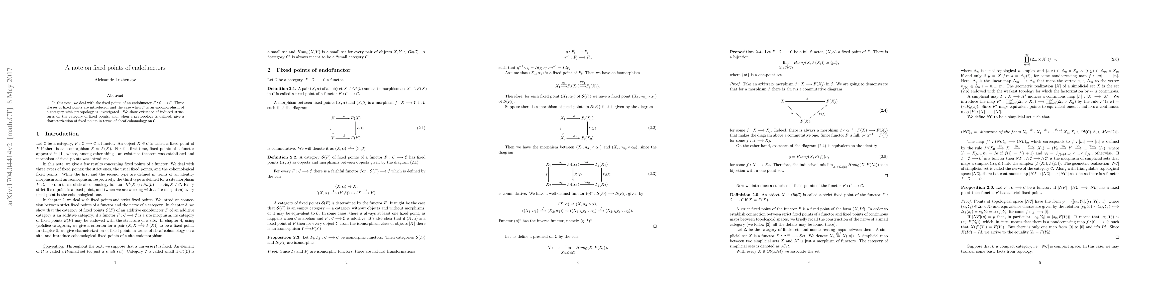 In this note, we deal with the fixed points of an endofunctor $F: \mathcal{C} \longrightarrow \mathcal{C}$. Three classes of fixed points are introduced, and the case when $F$ is an endomorphism of a category with pretopology is investigated. We show existence of induced structures on the category of fixed points, and, when a pretopology is defined, give a characterization of fixed points in terms of sheaf cohomology on $\mathcal{C}$.