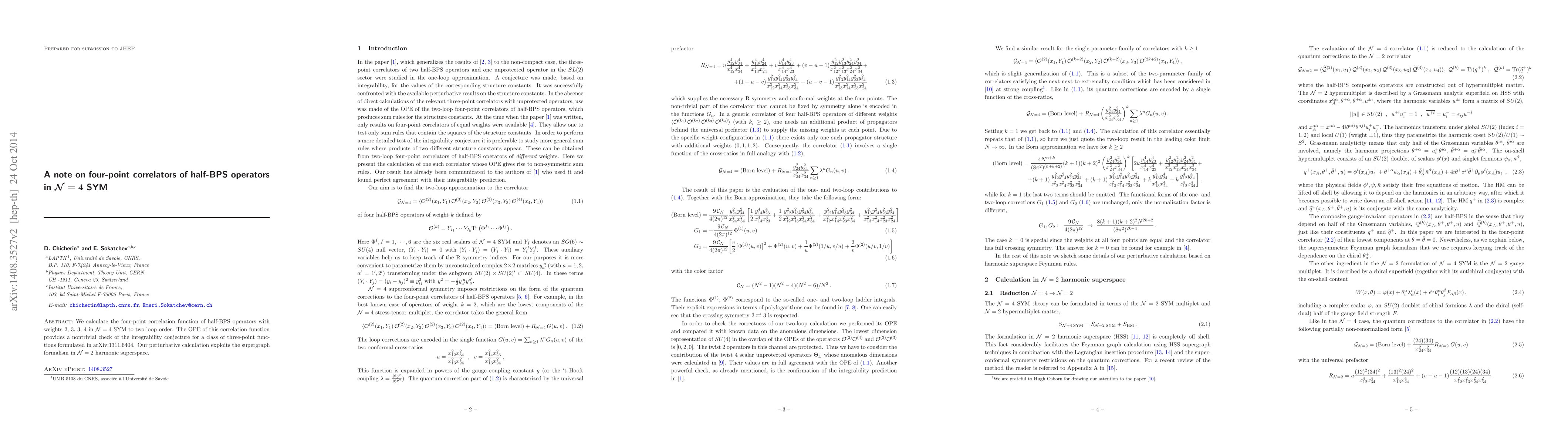 Summary: This research calculates the four-point correlation function of specific half-BPS operators in N=4 Super Yang-Mills theory to two-loop order, using the supergraph formalism in N=2 harmonic superspace, and validates the integrability conjecture through the OPE of these correlators.