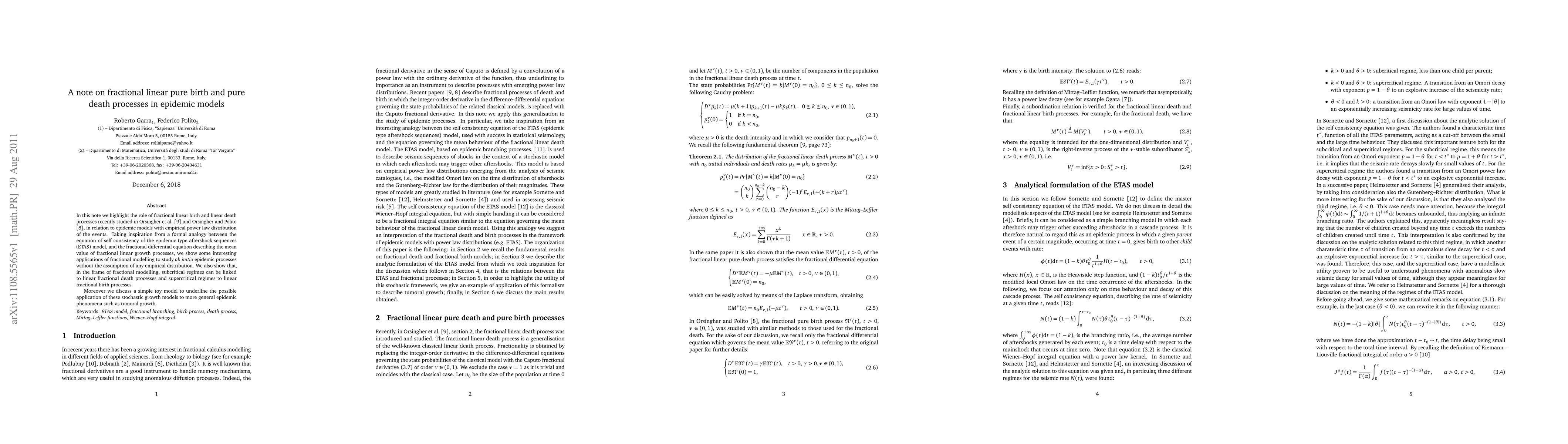 In this note we highlight the role of fractional linear birth and linear death processes recently studied in \citet{sakhno} and \citet{pol}, in relation to epidemic models with empirical power law distribution of the events. Taking inspiration from a formal analogy between the equation of self consistency of the epidemic type aftershock sequences (ETAS) model, and the fractional differential equation describing the mean value of fractional linear growth processes, we show some interesting applications of fractional modelling to study \textit{ab initio} epidemic processes without the assumption of any empirical distribution. We also show that, in the frame of fractional modelling, subcritical regimes can be linked to linear fractional death processes and supercritical regimes to linear fractional birth processes. Moreover we discuss a simple toy model to underline the possible application of these stochastic growth models to more general epidemic phenomena such as tumoral growth.