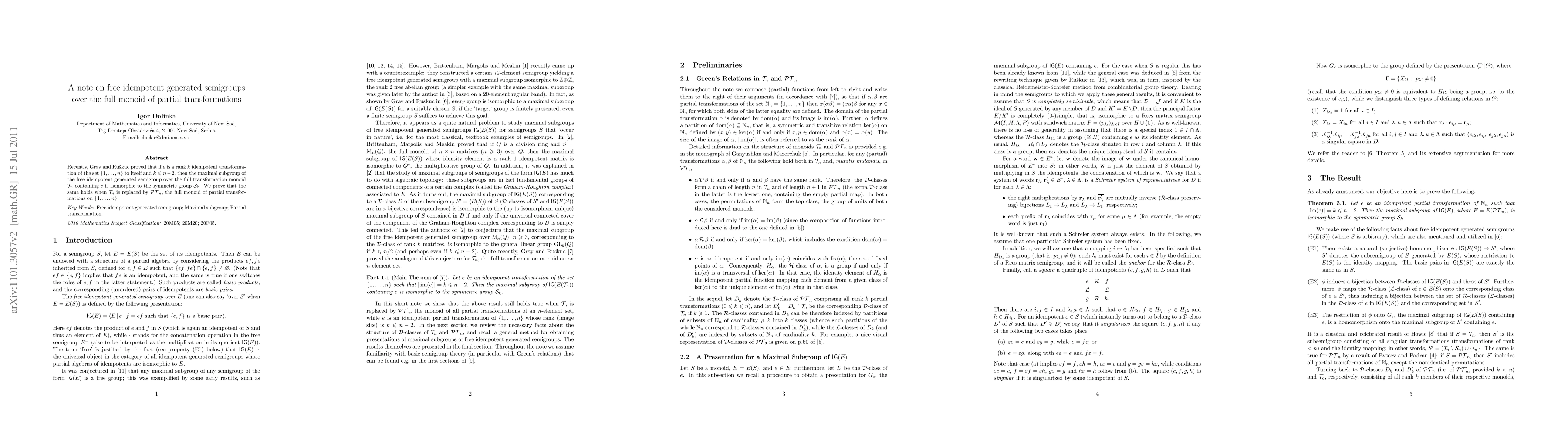 The paper presents a proof technique that extends previous findings on free idempotent generated semigroups over transformation monoids to partial transformation monoids, using advanced concepts from semigroup theory and combinatorial group theory.