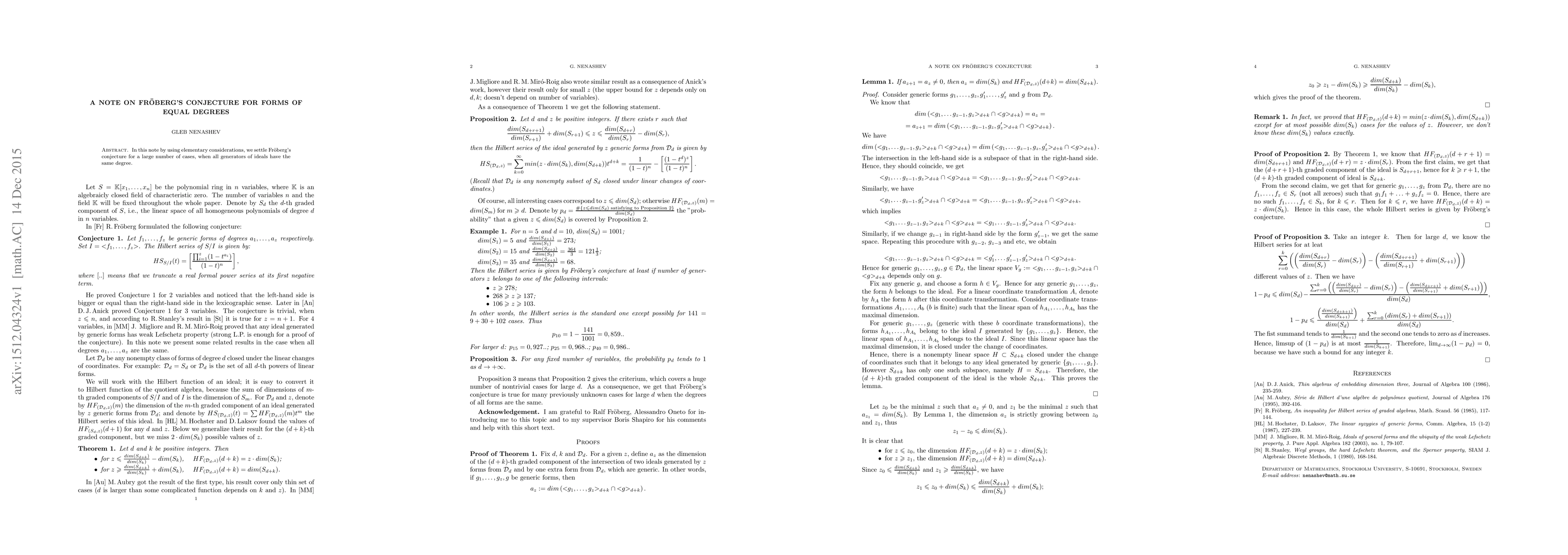 Summary: This paper resolves Fr\"oberg's conjecture for forms of equal degrees using elementary methods, demonstrating its validity for a wide range of cases where all generators share the same degree.