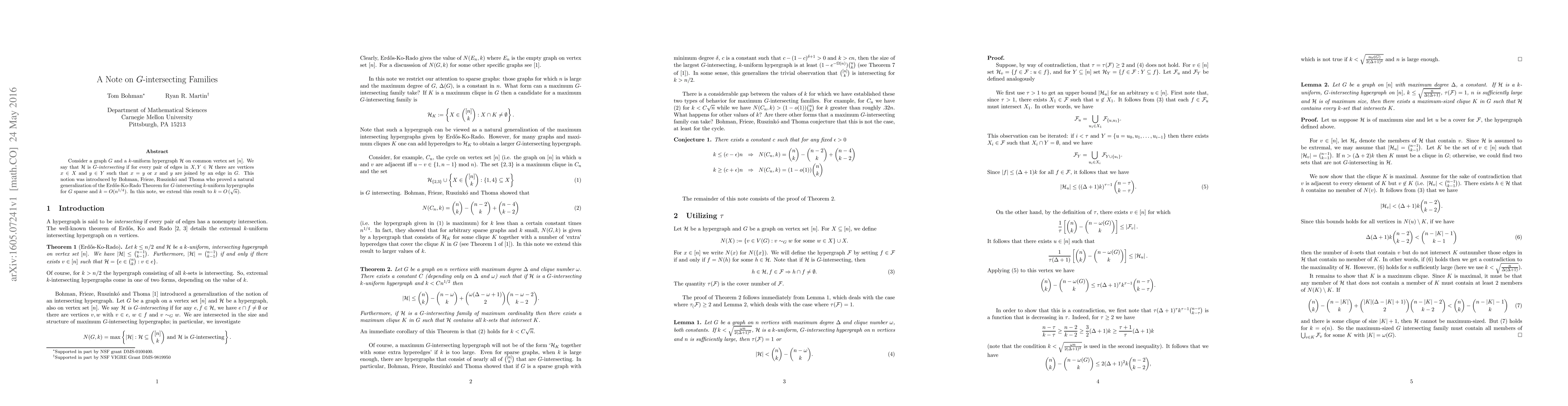 Consider a graph $G$ and a $k$-uniform hypergraph $\mathcal{H}$ on common vertex set $[n]$. We say that $\mathcal{H}$ is $G$-intersecting if for every pair of edges in $X,Y \in \mathcal{H}$ there are vertices $x \in X$ and $y \in Y$ such that $x = y$ or $x$ and $y$ are joined by an edge in $G$. This notion was introduced by Bohman, Frieze, Ruszink\'o and Thoma who proved a natural generalization of the Erd\H{o}s-Ko-Rado Theorem for $G$-intersecting $k$-uniform hypergraphs for $G$ sparse and $k = O( n^{1/4} )$. In this note, we extend this result to $k = O\left( \sqrt{n} \right)$.