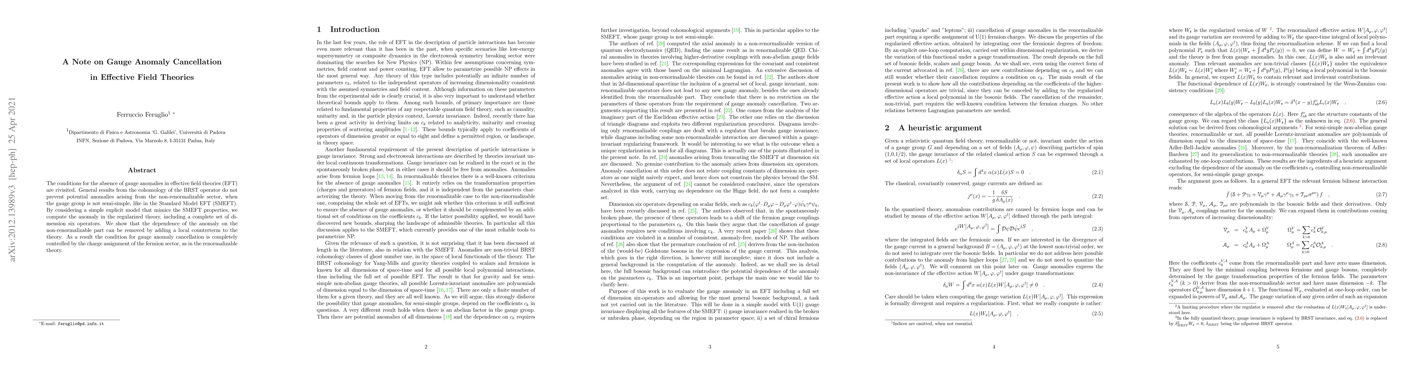 The conditions for the absence of gauge anomalies in effective field theories (EFT) are rivisited. General results from the cohomology of the BRST operator do not prevent potential anomalies arising from the non-renormalizable sector, when the gauge group is not semi-simple, like in the Standard Model EFT (SMEFT). By considering a simple explicit model that mimics the SMEFT properties, we compute the anomaly in the regularized theory, including a complete set of dimension six operators. We show that the dependence of the anomaly on the non-renormalizable part can be removed by adding a local counterterm to the theory. As a result the condition for gauge anomaly cancellation is completely controlled by the charge assignment of the fermion sector, as in the renormalizable theory.