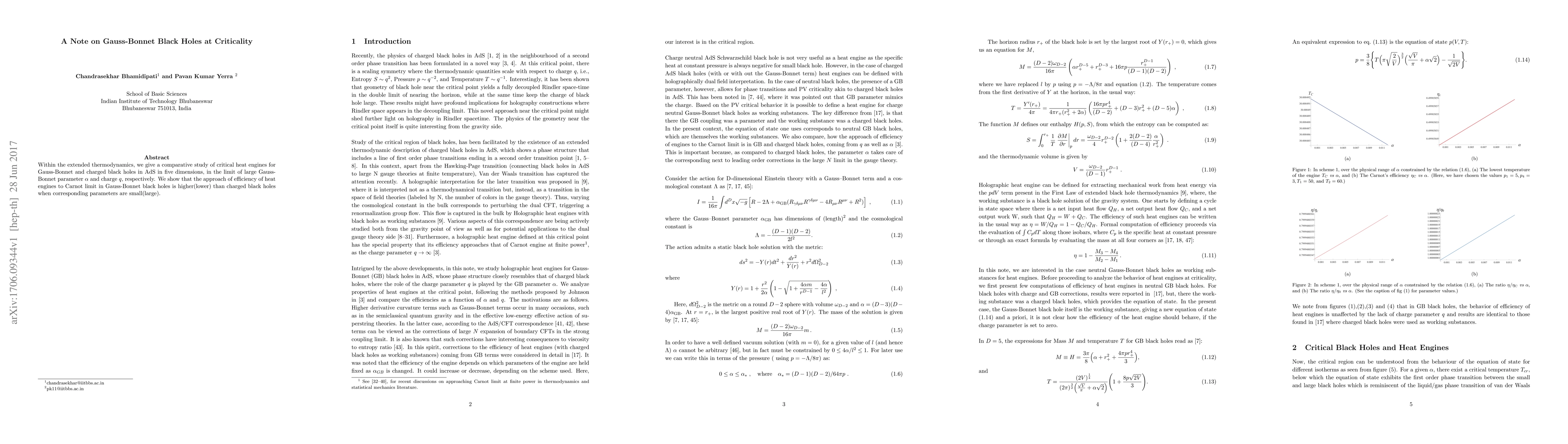 This paper compares critical heat engines for Gauss-Bonnet and charged black holes in five-dimensional AdS space, finding that Gauss-Bonnet black holes approach the Carnot efficiency limit more effectively than charged black holes when parameters are small, but less effectively when they are large.