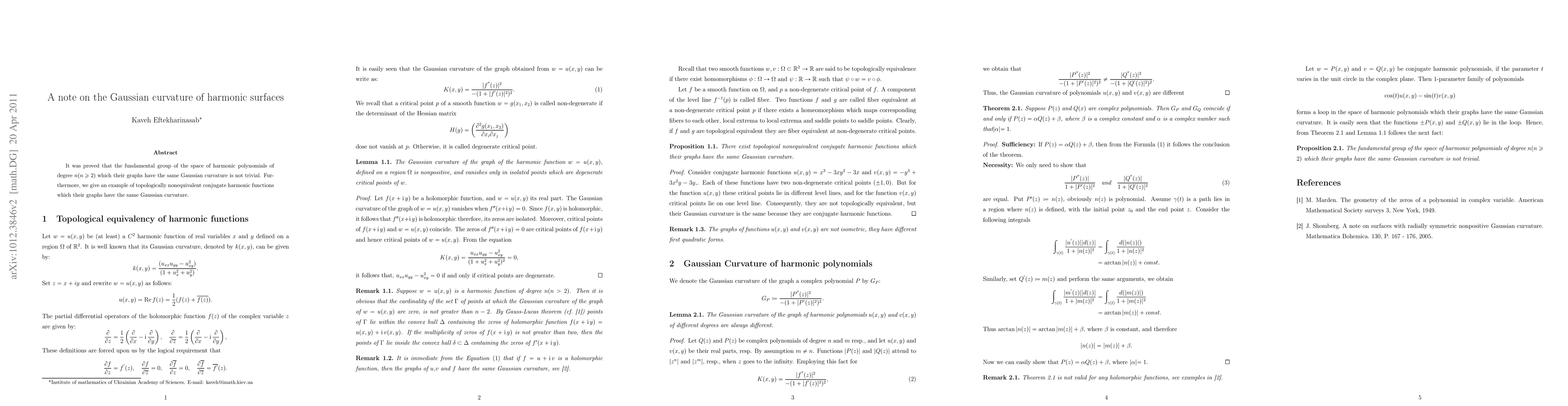 It was proved that the fundamental group of the space of harmonic polynomials of degree $n(n \geq 2)$, with the same Gaussian curvature is not trivial. Furthermore, we give an example of topologically nonequivalent conjugate harmonic functions having the same Gaussian curvature.