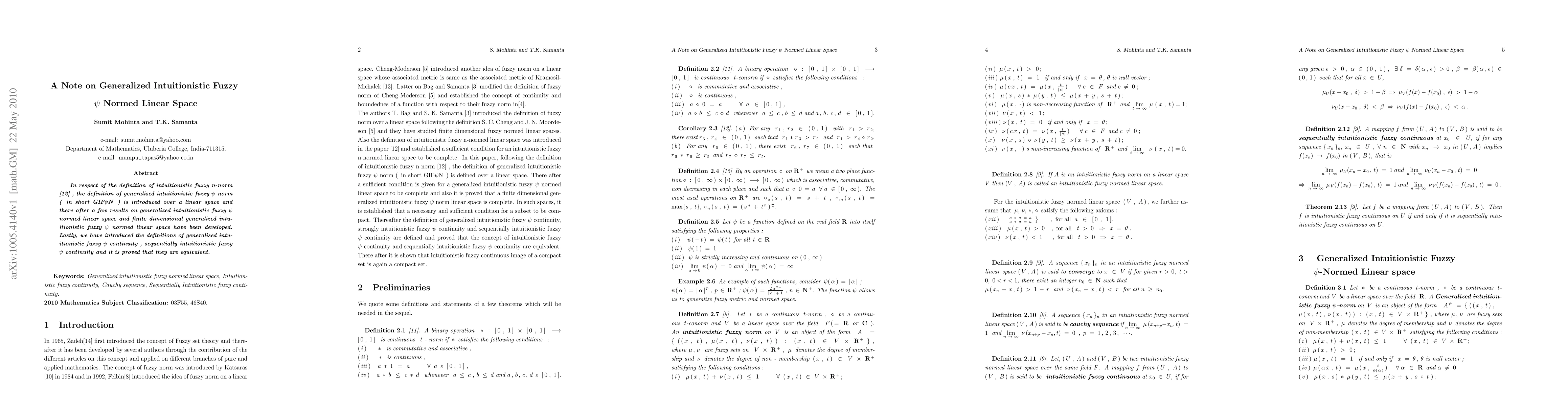 In respect of the definition of intuitionistic fuzzy n-norm \cite{Vijayabalaji}, the definition of generalised intuitionistic fuzzy $\psi$ norm (\, in short GIF$\psi$N \,) is introduced over a linear space and there after a few results on generalized intuitionistic fuzzy $\psi$ normed linear space and finite dimensional generalized intuitionistic fuzzy $\psi$ normed linear space have been developed. Lastly, we have introduced the definitions of generalised intuitionistic fuzzy $\psi$ continuity , sequentially intuitionistic fuzzy $\psi$ continuity and it is proved that they are equivalent.