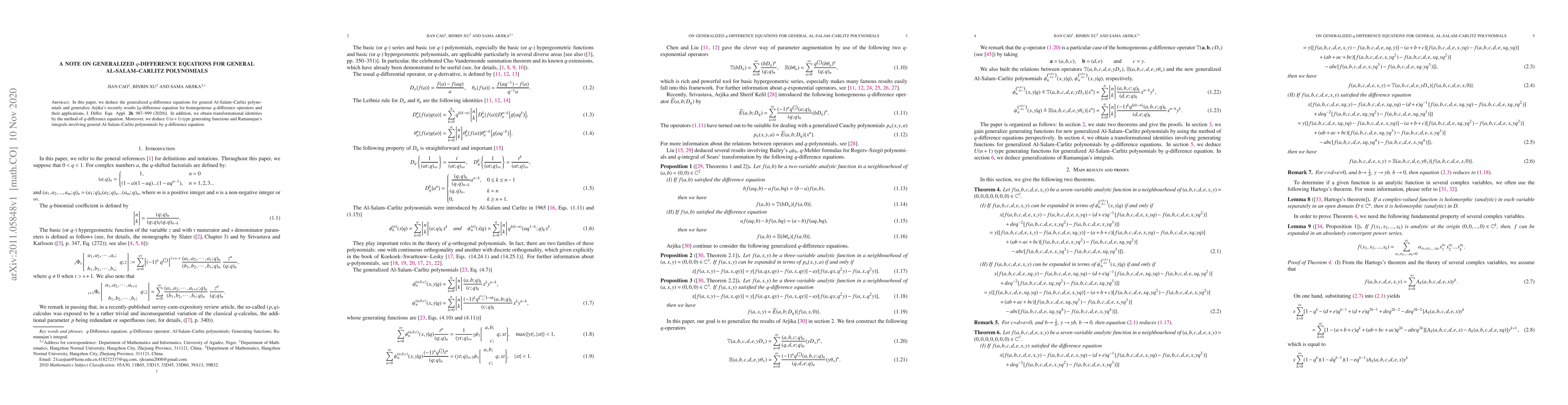 This paper deduces generalized $q$-difference equations for general Al-Salam--Carlitz polynomials, extending Arjika's results, and derives transformational identities and $U(n+1)$ type generating functions using $q$-difference equations.