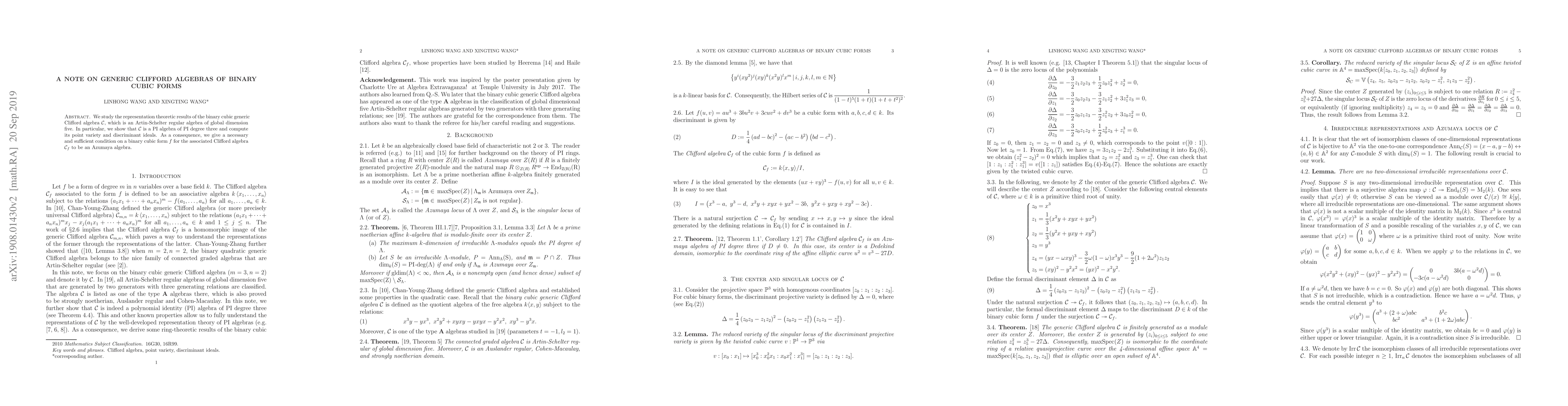 We study the representation theoretic results of the binary cubic generic Clifford algebra $\mathcal C$, which is an Artin-Schelter regular algebra of global dimension five. In particular, we show that $\mathcal C$ is a PI algebra of PI degree three and compute its point variety and discriminant ideals. As a consequence, we give a necessary and sufficient condition on a binary cubic form $f$ for the associated Clifford algebra $\mathcal C_f$ to be an Azumaya algebra.