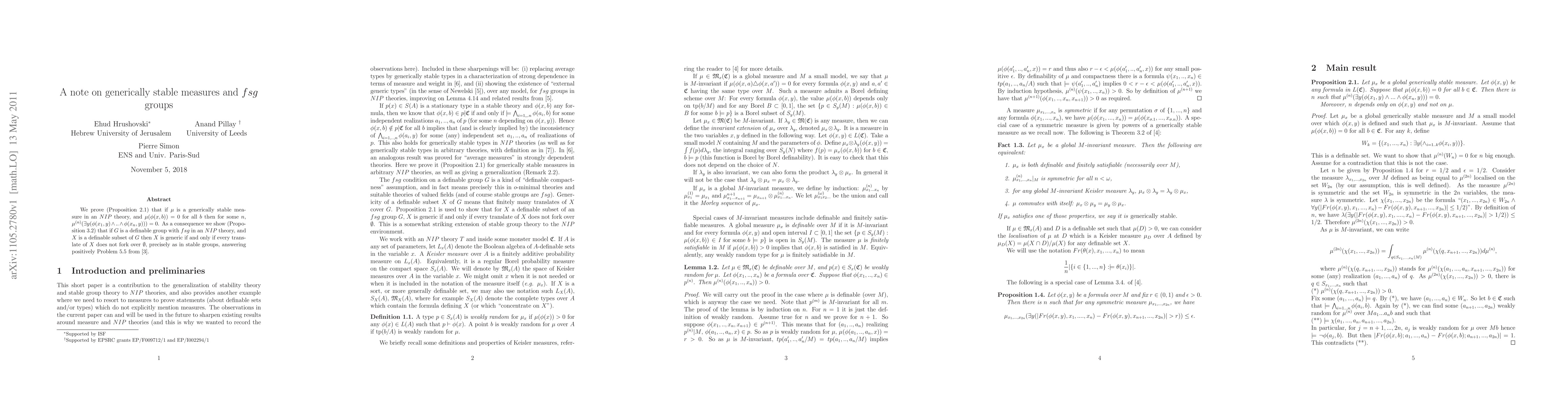 Summary: This paper proves that a generically stable measure in a first-order theory with NIP, which vanishes on certain formulas, also vanishes on existential combinations of these formulas. It concludes that in fsg groups, a definable subset is generic if and only if no translate of it forks over the empty set.