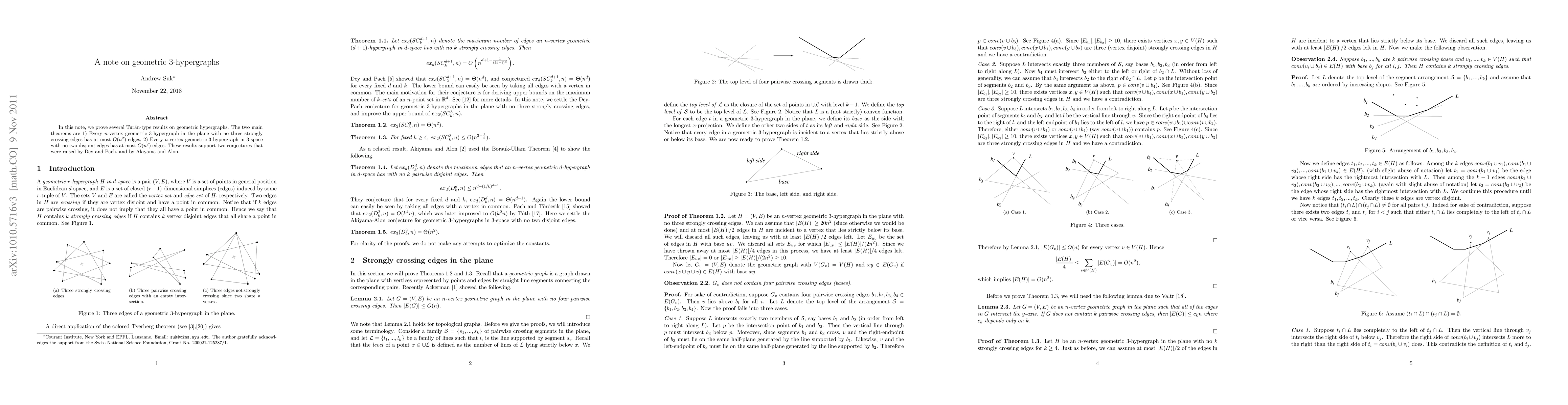 In this note, we prove several Tur\'an-type results on geometric hypergraphs. The two main theorems are 1) Every $n$-vertex geometric 3-hypergraph in 2-space with no three strongly crossing edges has at most $O(n^2)$ edges, 2) Every $n$-vertex geometric 3-hypergraph in 3-space with no two disjoint edges has at most $O(n^2)$ edges. These results support two conjectures that were raised by Dey and Pach, and by Akiyama and Alon.