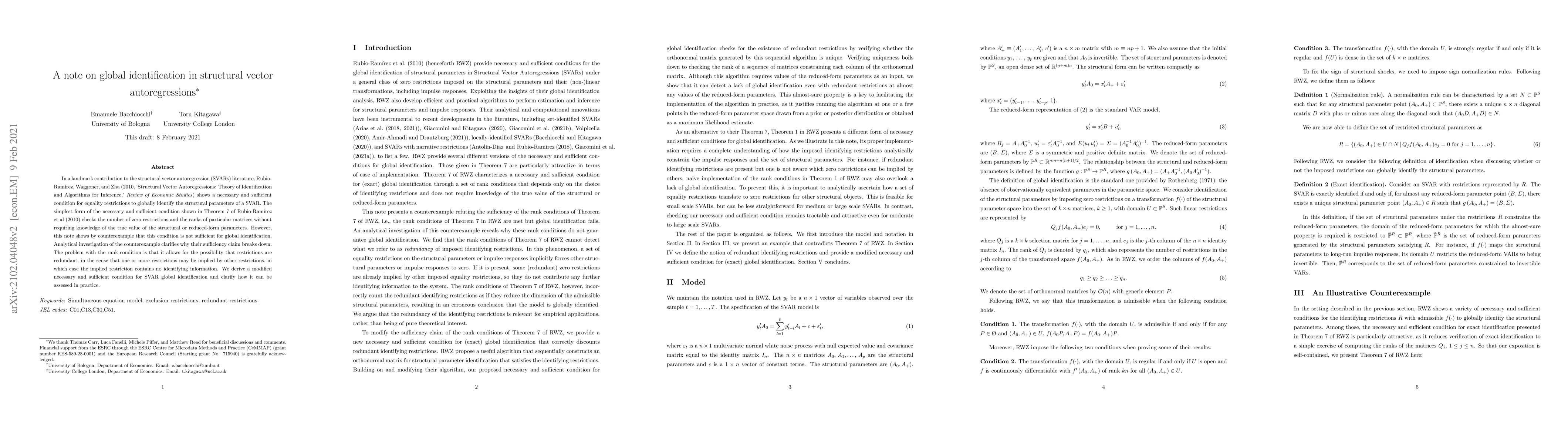 This paper critiques a previously proposed necessary and sufficient condition for global identification in SVARs, demonstrating its insufficiency through a counterexample. It proposes a revised condition that addresses the issue of redundant restrictions and provides practical guidance for its application.