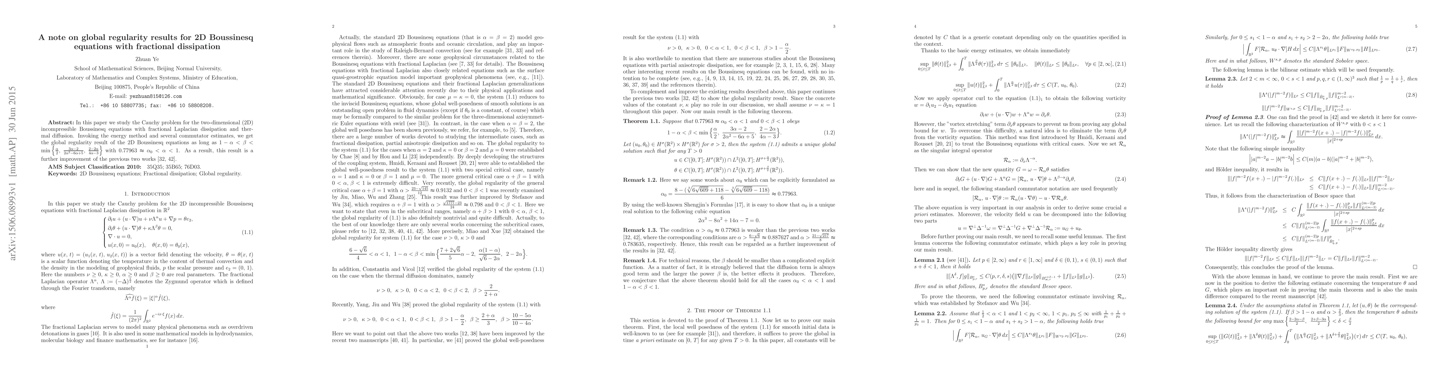 This paper investigates the Cauchy problem for the 2D incompressible Boussinesq equations with fractional Laplacian dissipation, achieving global regularity under specific conditions on the dissipation parameters. The result improves upon previous findings by utilizing the energy method and commutator estimates.