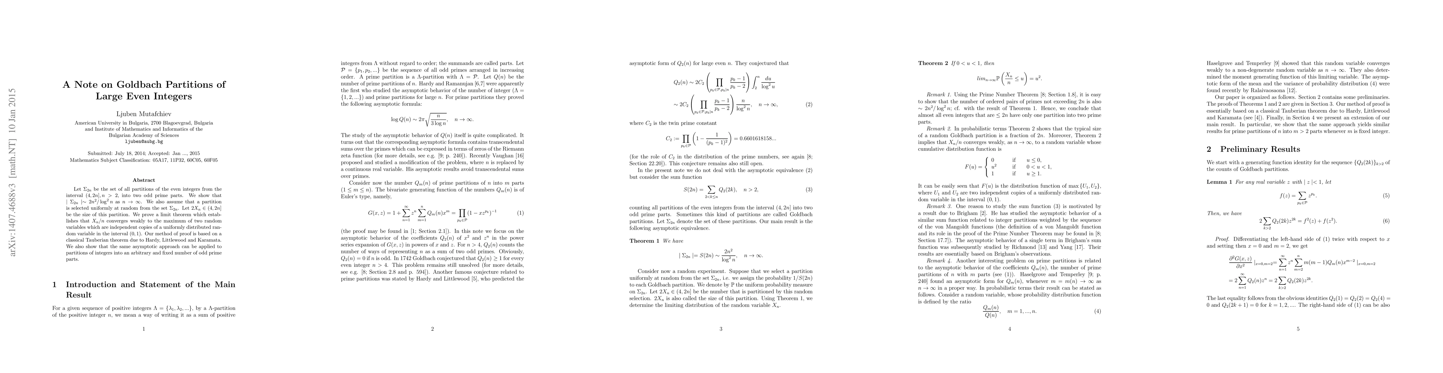 This paper investigates the number of partitions of large even integers into two odd primes, showing that this count asymptotically behaves as $2n^2/\log^2{n}$. It also proves that the size of a randomly selected partition converges weakly to the maximum of two independent uniform random variables on $(0,1)$, employing a Tauberian theorem.