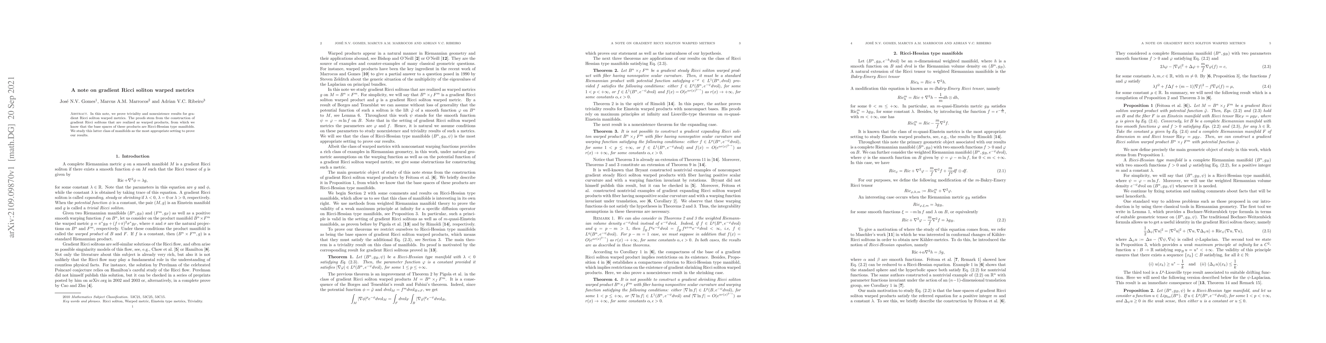 This paper proves that gradient Ricci soliton warped metrics are trivial and non-existent, utilizing the construction of such solitons as warped products and studying Ricci-Hessian type manifolds to derive these results.