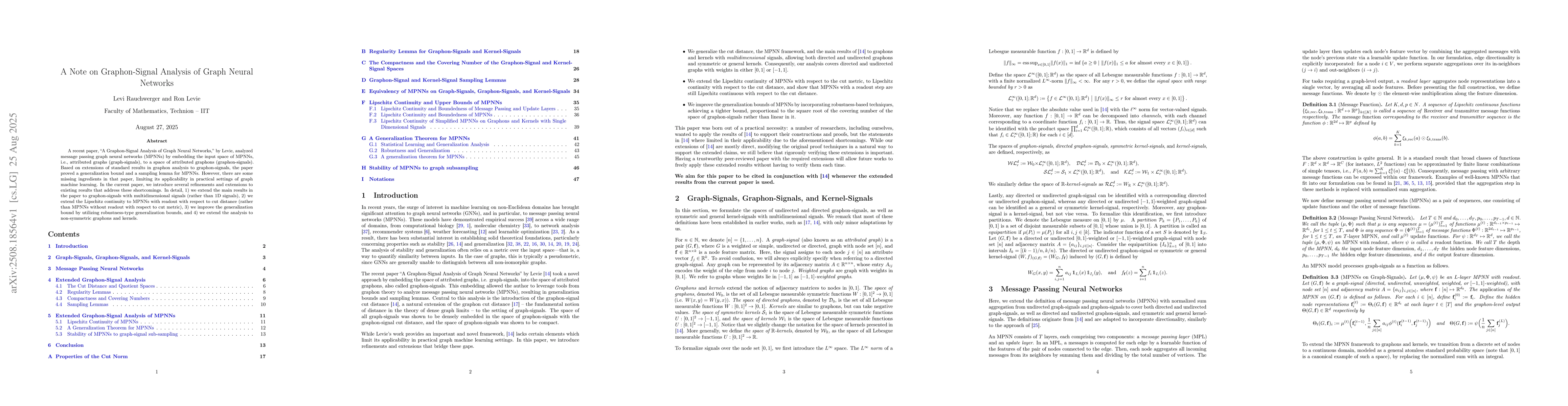 A recent paper, ``A Graphon-Signal Analysis of Graph Neural Networks'', by Levie, analyzed message passing graph neural networks (MPNNs) by embedding the input space of MPNNs, i.e., attributed graphs (graph-signals), to a space of attributed graphons (graphon-signals). Based on extensions of standard results in graphon analysis to graphon-signals, the paper proved a generalization bound and a sampling lemma for MPNNs. However, there are some missing ingredients in that paper, limiting its applicability in practical settings of graph machine learning. In the current paper, we introduce several refinements and extensions to existing results that address these shortcomings. In detail, 1) we extend the main results in the paper to graphon-signals with multidimensional signals (rather than 1D signals), 2) we extend the Lipschitz continuity to MPNNs with readout with respect to cut distance (rather than MPNNs without readout with respect to cut metric), 3) we improve the generalization bound by utilizing robustness-type generalization bounds, and 4) we extend the analysis to non-symmetric graphons and kernels.