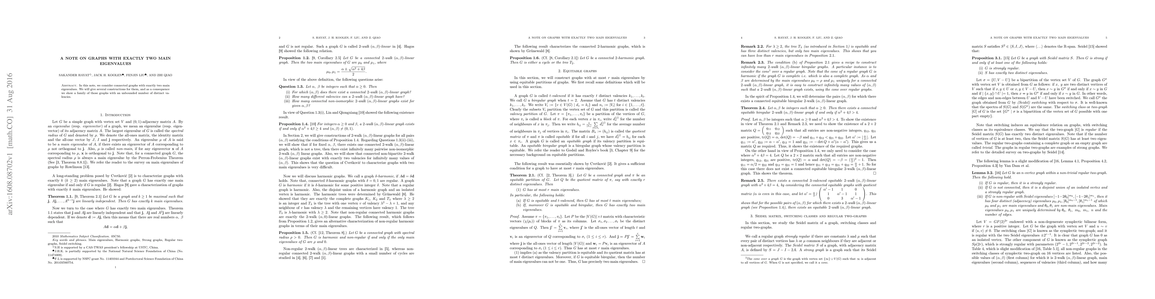 Summary: This paper explores connected graphs possessing exactly two main eigenvalues, presenting various constructions and demonstrating a family of such graphs that exhibit an infinite range of distinct vertex degrees.