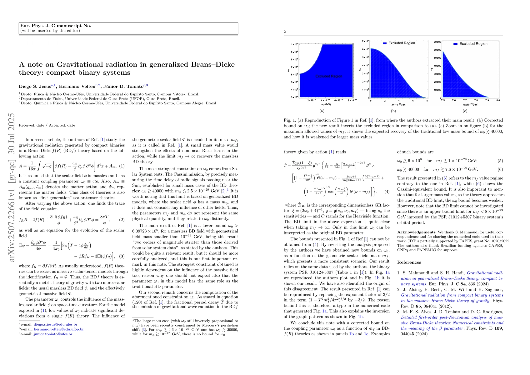The research corrects a previous analysis on gravitational radiation in compact binary systems within generalized Brans-Dicke-f(R) theories, featuring massless and effectively massive scalar fields, by reanalyzing data from the binary system PSR J1012+5307.