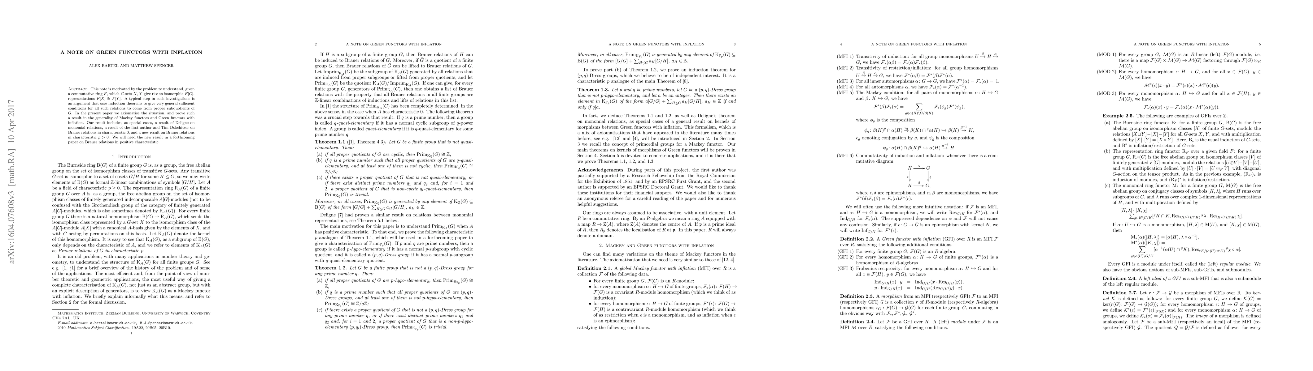 This note is motivated by the problem to understand, given a commutative ring F, which G-sets X, Y give rise to isomorphic F[G]-representations F[X]\cong F[Y]. A typical step in such investigations is an argument that uses induction theorems to give very general sufficient conditions for all such relations to come from proper subquotients of G. In the present paper we axiomatise the situation, and prove such a result in the generality of Mackey functors and Green functors with inflation. Our result includes, as special cases, a result of Deligne on monomial relations, a result of the first author and Tim Dokchitser on Brauer relations in characteristic 0, and a new result on Brauer relations in characteristic p>0. We will need the new result in a forthcoming paper on Brauer relations in positive characteristic.
