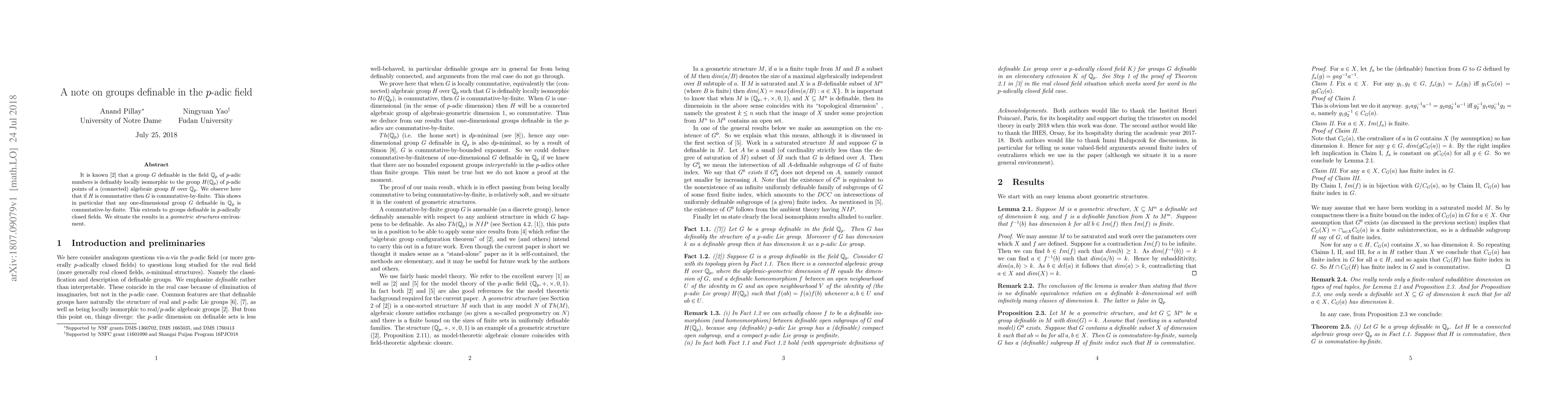 This paper demonstrates that a group definable in the p-adic field is definably locally isomorphic to a connected algebraic group's Q_p-points. It concludes that if this algebraic group is commutative, then the definable group is commutative-by-finite, thereby proving that any one-dimensional definable group in Q_p is commutative-by-finite. The findings also apply to groups definable in p-adically closed fields.