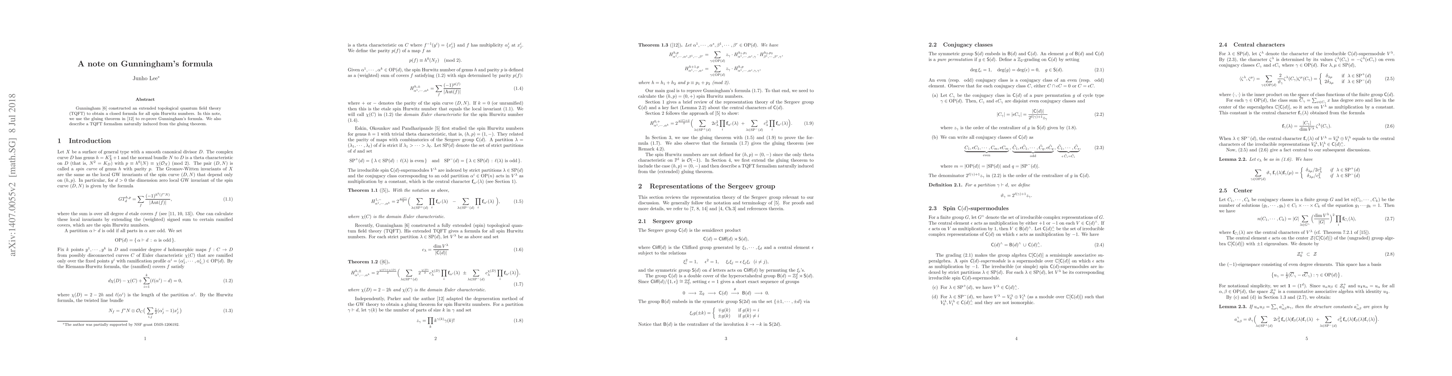 Gunningham [G] constructed an extended topological quantum field theory (TQFT) to obtain a closed formula for all spin Hurwitz numbers. In this note, we use the gluing theorem in [LP2] to re-prove the Gunningham's formula. We also describe a TQFT formalism naturally induced from the gluing theorem.