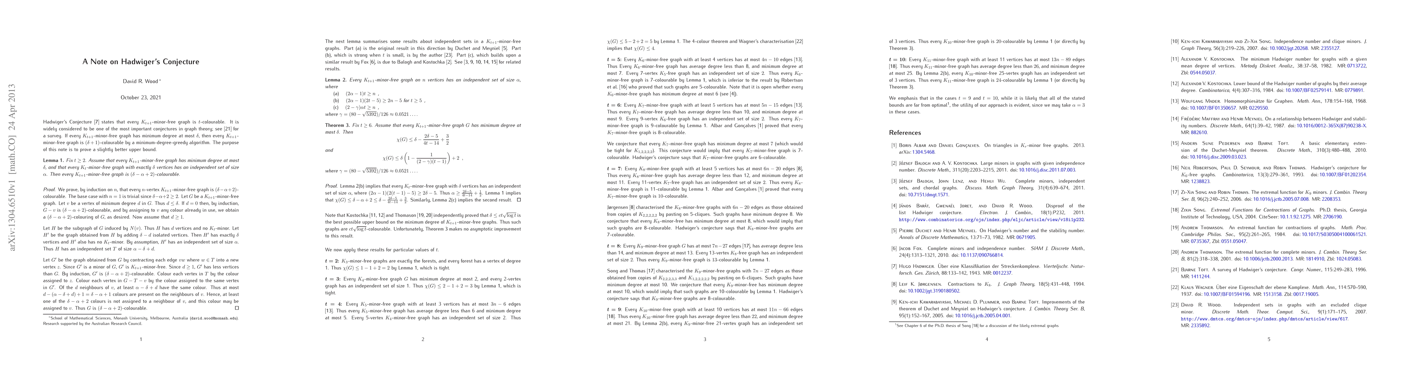 Hadwiger's Conjecture states that every $K_{t+1}$-minor-free graph is $t$-colourable. It is widely considered to be one of the most important conjectures in graph theory. If every $K_{t+1}$-minor-free graph has minimum degree at most $\delta$, then every $K_{t+1}$-minor-free graph is $(\delta+1)$-colourable by a minimum-degree-greedy algorithm. The purpose of this note is to prove a slightly better upper bound.