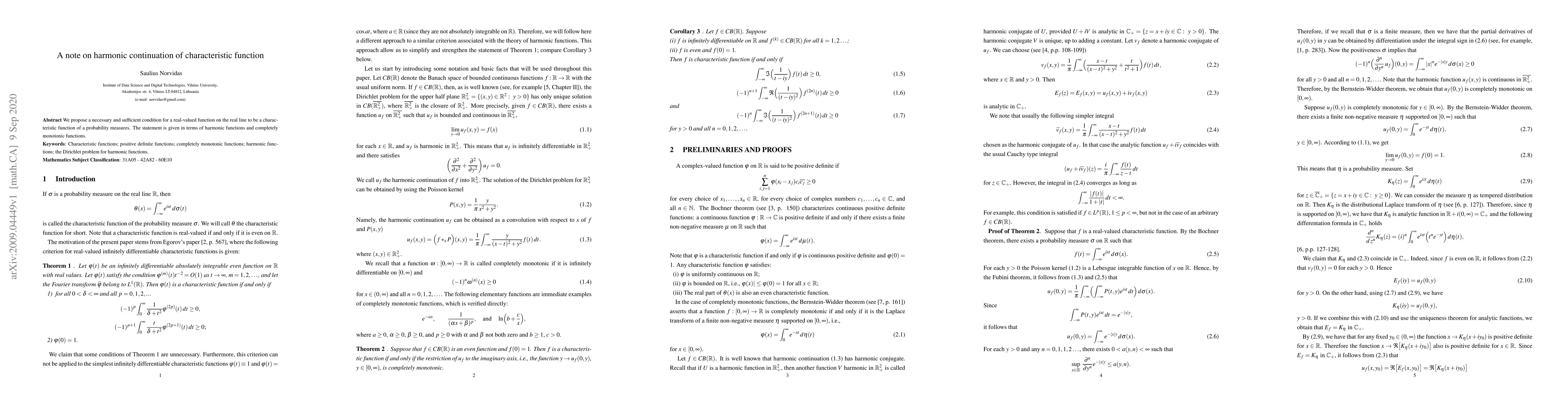 This paper proposes a condition for a real-valued function to be a characteristic function of a probability measure, using harmonic functions and completely monotonic functions. It provides a necessary and sufficient criterion for such functions.