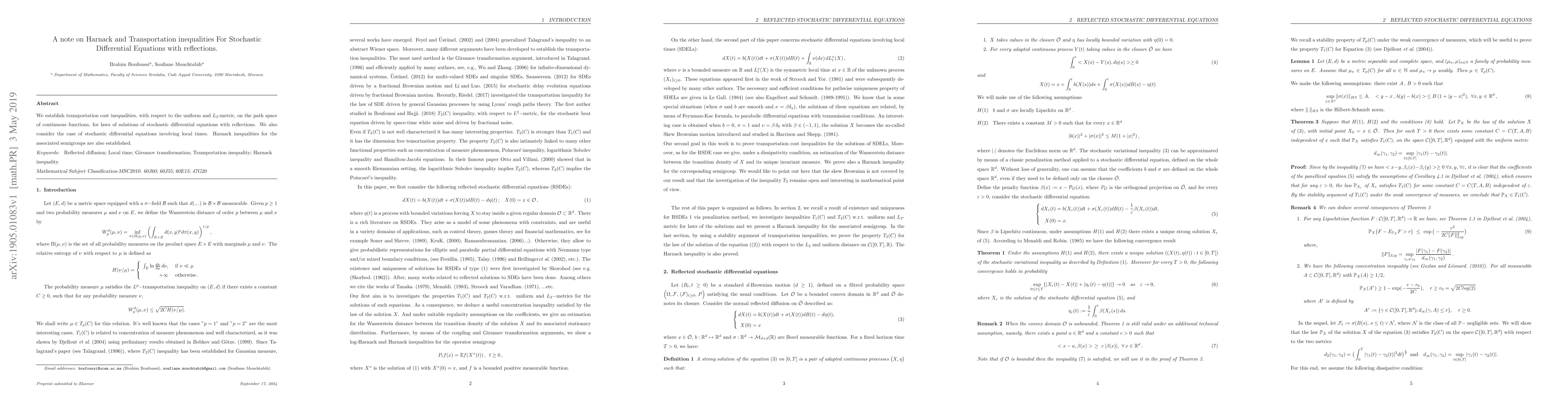 This paper establishes transportation cost inequalities for stochastic differential equations with reflections, focusing on uniform and $L_2$-metrics on path spaces. Additionally, it explores Harnack inequalities for the associated semigroups and considers stochastic differential equations involving local times.