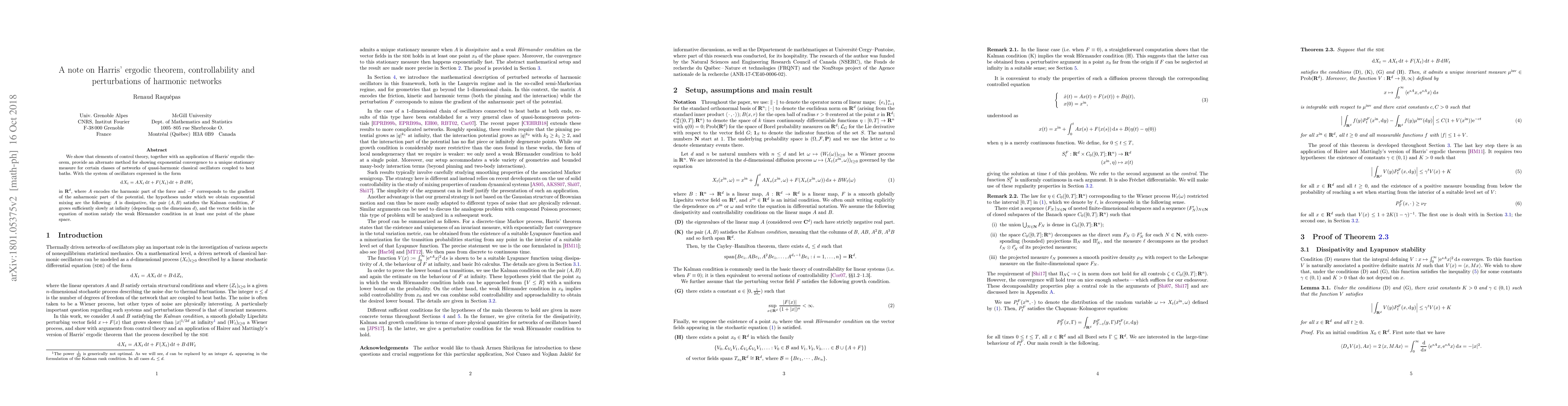 This research paper applies control theory and Harris' ergodic theorem to show exponential convergence to a unique stationary measure for certain networks of quasi-harmonic oscillators coupled to heat baths.