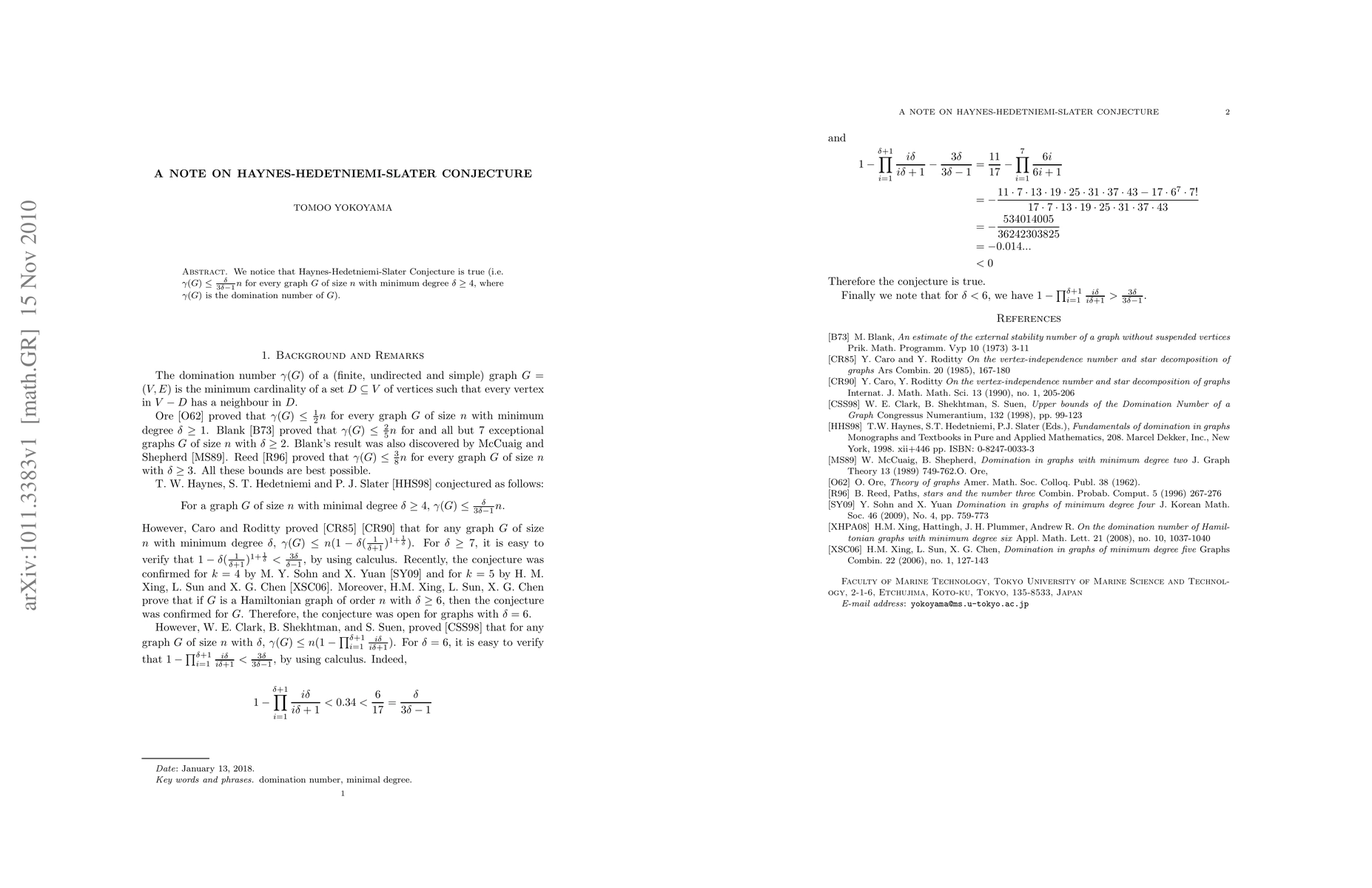 We notice that Haynes-Hedetniemi-Slater Conjecture is true (i.e. $\gamma(G) \leq \frac{\delta}{3\delta -1}n$ for every graph $G$ of size $n$ with minimum degree $\delta \geq 4$, where $\gamma(G)$ is the domination number of $G$). Because the conjecture for $\delta =6$ follows from the estimate n (1 - \prod_{i= 1}^[\delta + 1} (\delta i)/(\delta i + 1) by W. E. Clark, B. Shekhtman, S. Suen [Upper bounds of the Domination Number of a Graph, Congressus Numerantium, 132 (1998), pp. 99-123.]