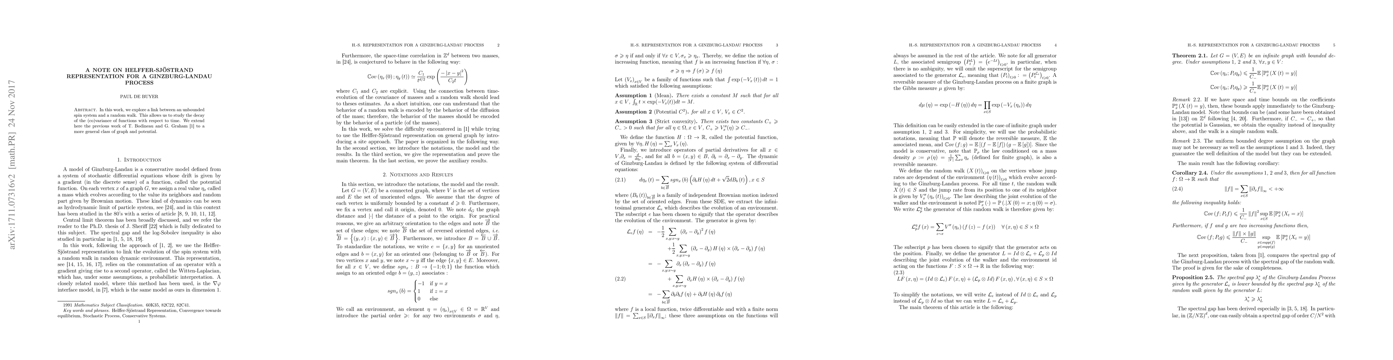 In this work, we explore a link between an unbounded spin system given by a system of stochastic differential equations and a random walk. This allows us to study the decay of the (co)variance of functions with respect to time. We extend here the previous work of T. Bodineau and G. Graham to a more general class of graph and potential.