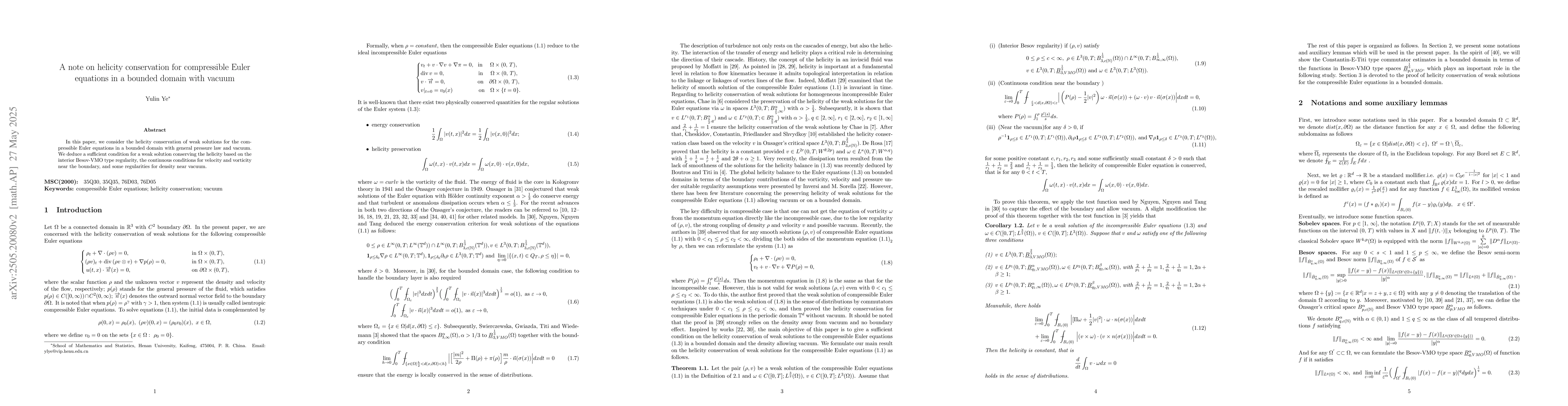 The paper presents a novel sufficient condition for helicity conservation in weak solutions under specified regularity assumptions in a bounded domain with vacuum.