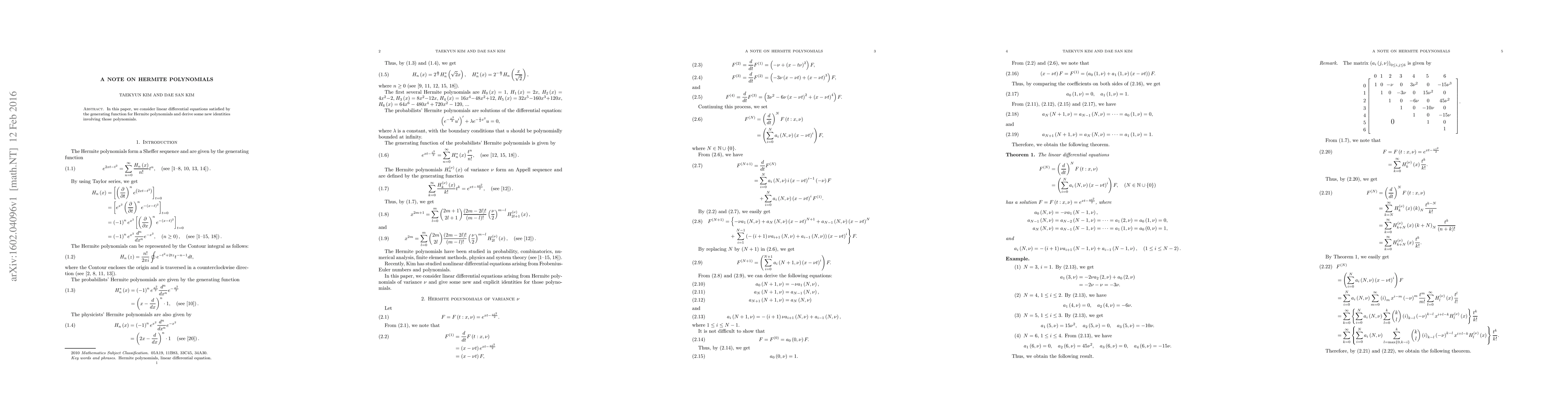 Summary: This paper explores linear differential equations associated with the generating function of Hermite polynomials and establishes novel identities related to these polynomials.