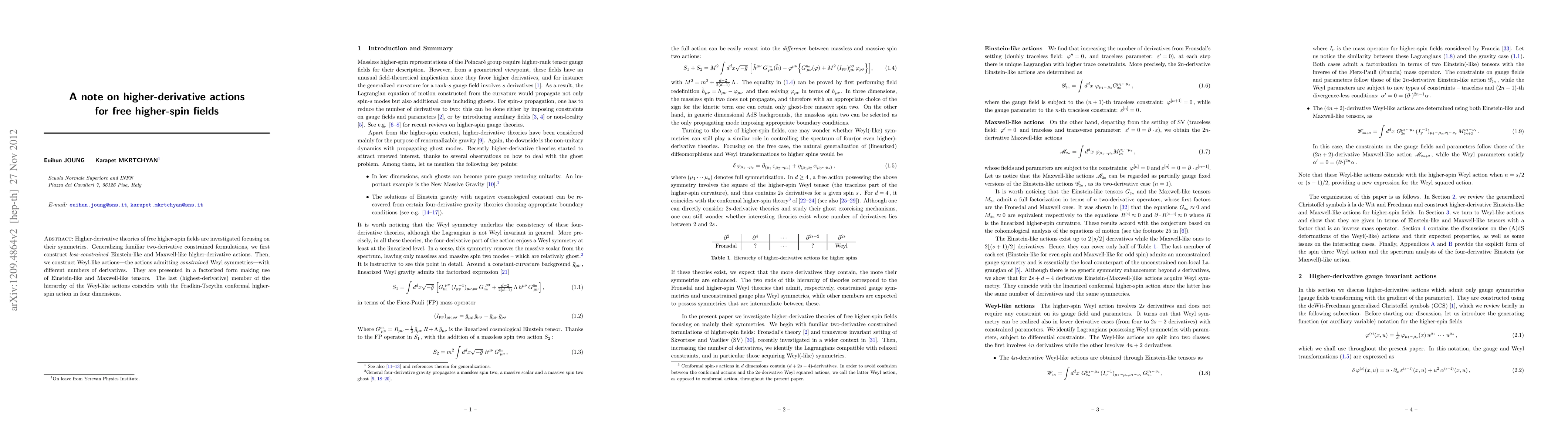 The paper explores higher-derivative actions for free higher-spin fields, constructing less-constrained Einstein-like and Maxwell-like actions, and Weyl-like actions with various derivatives, which culminate in the Fradkin-Tseytlin conformal higher-spin action in four dimensions.