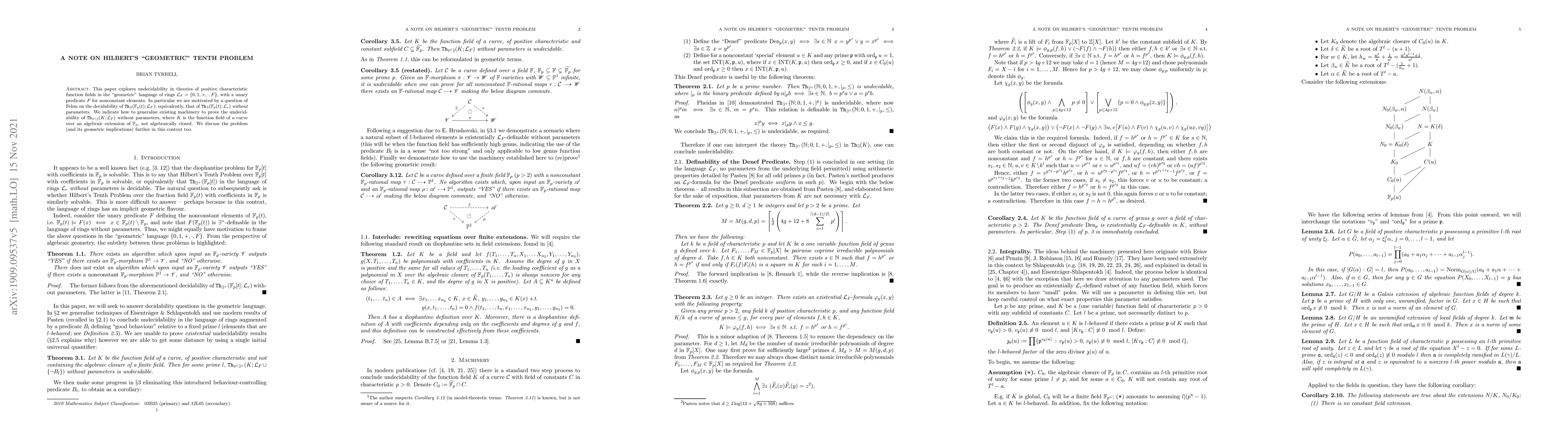 This paper explores undecidability in theories of positive characteristic function fields in the "geometric" language of rings $\mathcal{L}_F = \{0, 1, +, \cdot, F\}$, with a unary predicate $F$ for nonconstant elements. In particular we are motivated by a question of Fehm on the decidability of $\mbox{Th}_{\exists}(\mathbb{F}_p(t); \mathcal{L}_F)$; equivalently, that of $\mbox{Th}_{\exists}(\mathbb{F}_p(t); \mathcal{L}_r)$ without parameters. We indicate how to generalise existing machinery to prove the undecidability of $\mbox{Th}_{\forall^1\exists}(K; \mathcal{L}_F)$ without parameters, where $K$ is the function field of a curve over an algebraic extension of $\mathbb{F}_p$, not algebraically closed. We discuss the problem (and its geometric implications) further in this context too.