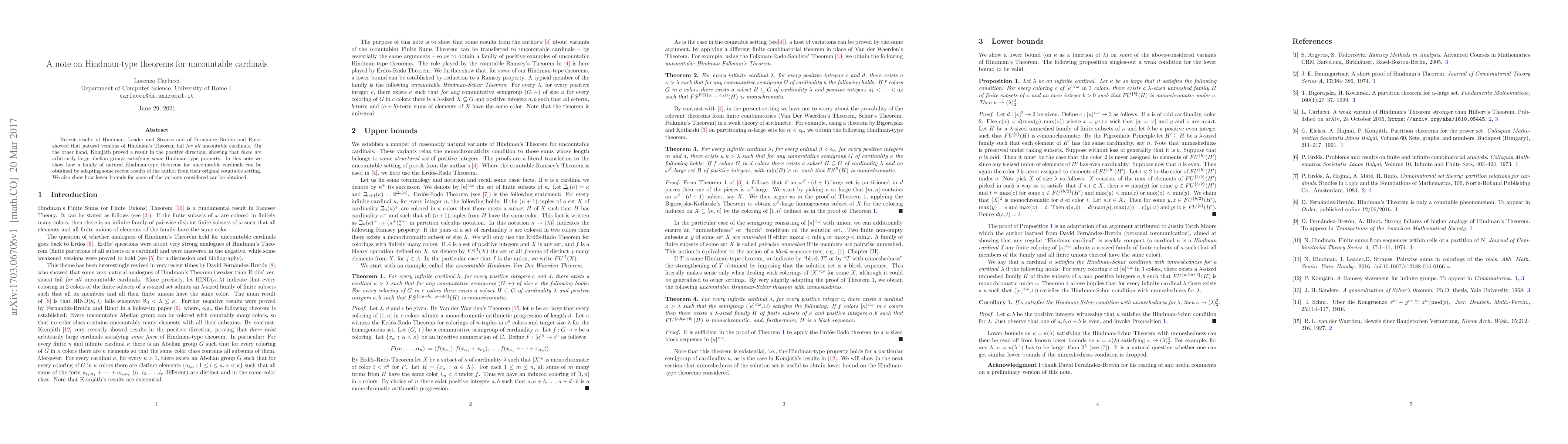 Recent results of Hindman, Leader and Strauss and of Fern\'andez-Bret\'on and Rinot showed that natural versions of Hindman's Theorem fail {\em for all} uncontable cardinals. On the other hand, Komj\'ath proved a result in the positive direction, showing that {\em there are} arbitrarily large abelian groups satisfying {\em some} Hindman-type property. In this note we show how a family of natural Hindman-type theorems for uncountable cardinals can be obtained by adapting some recent results of the author from their original countable setting. We also show how lower bounds for {\em some} of the variants considered can be obtained.