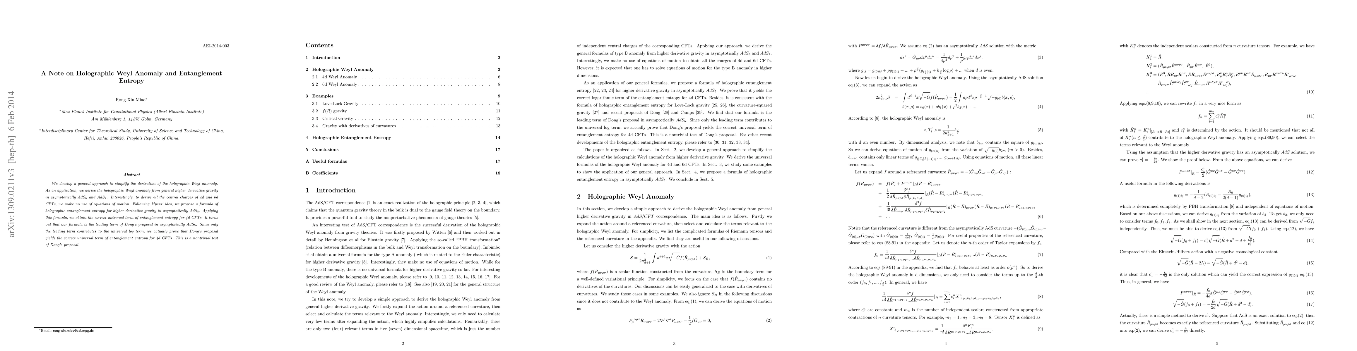 This paper simplifies the derivation of the holographic Weyl anomaly in higher derivative gravity in $AdS_5$ and $AdS_7$ without using equations of motion, and proposes a formula for holographic entanglement entropy in $AdS_5$ that confirms Dong's proposal for the universal log term of entanglement entropy in 4d CFTs.