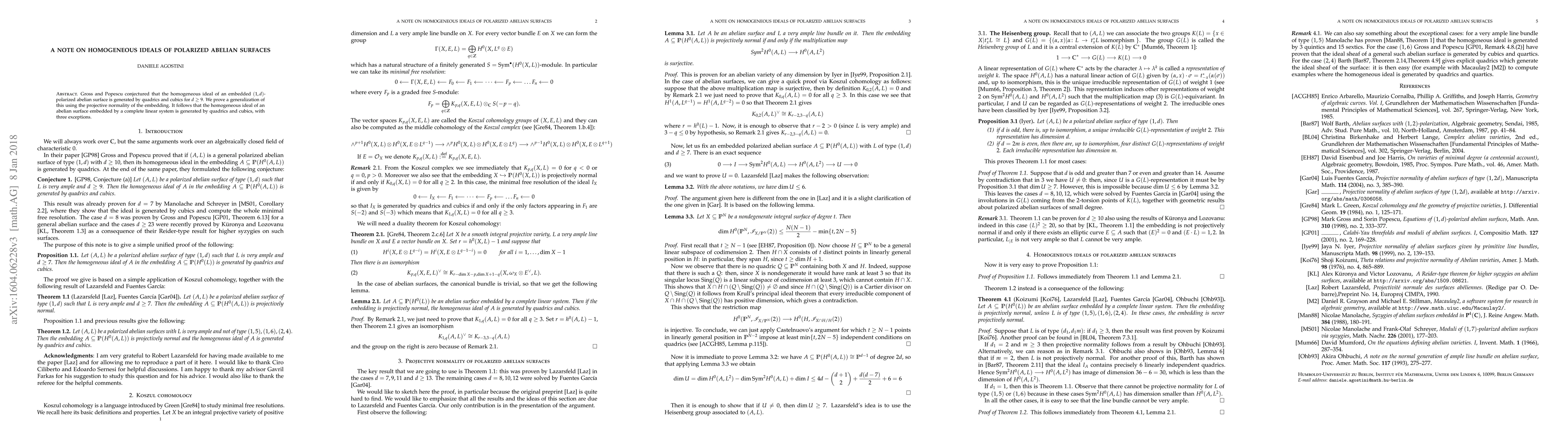 Gross and Popescu conjectured that the homogeneous ideal of an embedded $(1,d)$-polarized abelian surface is generated by quadrics and cubics for $d\geq 9$. We prove this using the projective normality of the embedding. It follows that the homogeneous ideal of an abelian surface embedded by a complete linear system is generated by quadrics and cubics, with three exceptions.
