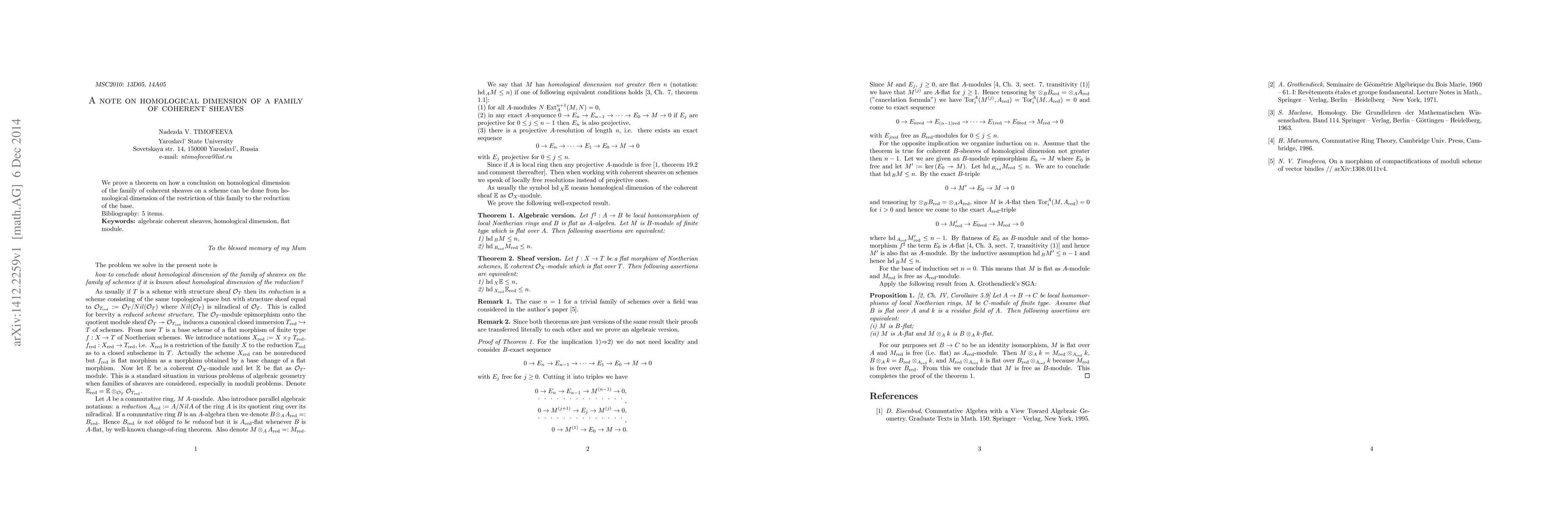 Summary: This paper proves a theorem relating the homological dimension of a family of coherent sheaves over a scheme to that of their restriction to the reduction of the base, offering a method to determine homological dimensions based on base reductions.