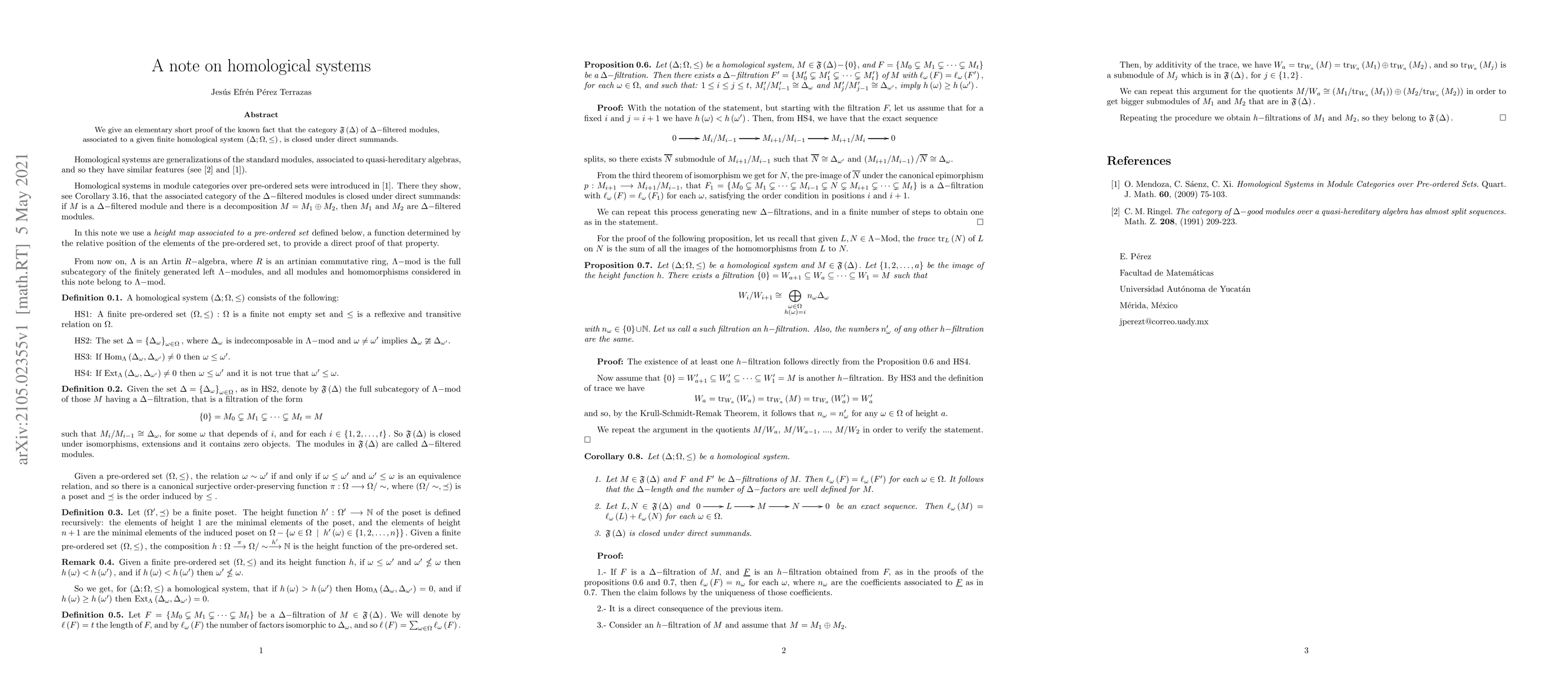 I give an elementary proof of the known fact that the category $\mathfrak{F} \left( \Delta \right)$ of $\Delta -$filtered modules, associated to a given finite homological system $\left( \Delta ; \Omega , \leq \right) ,$ is closed under direct summands.