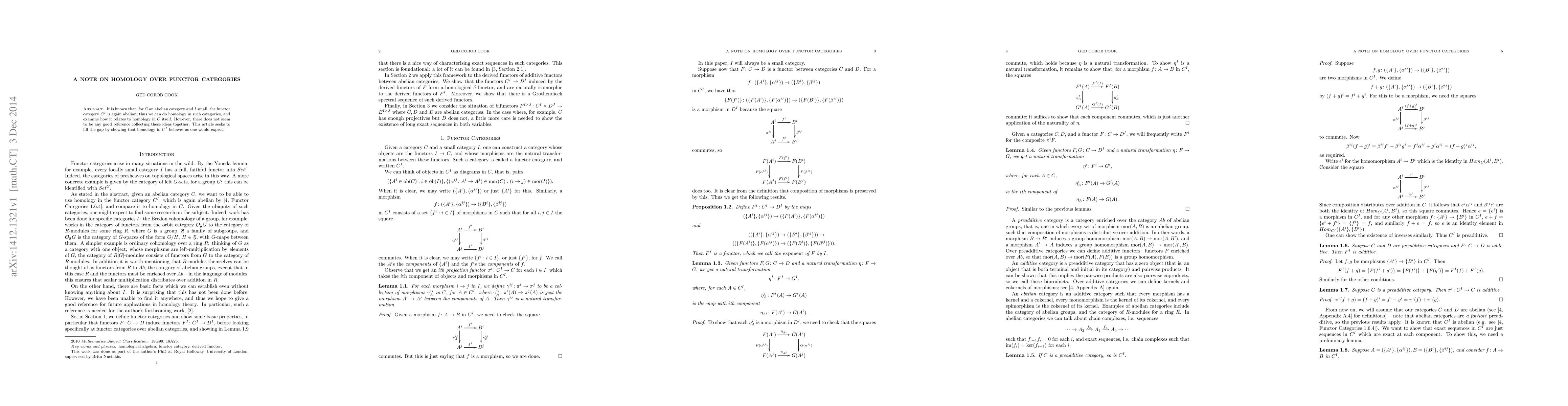 This paper explores the homology theory in functor categories $C^I$ when $C$ is an abelian category and $I$ is small, demonstrating its expected behavior in relation to homology in $C$ itself and aiming to consolidate existing ideas in a single reference.