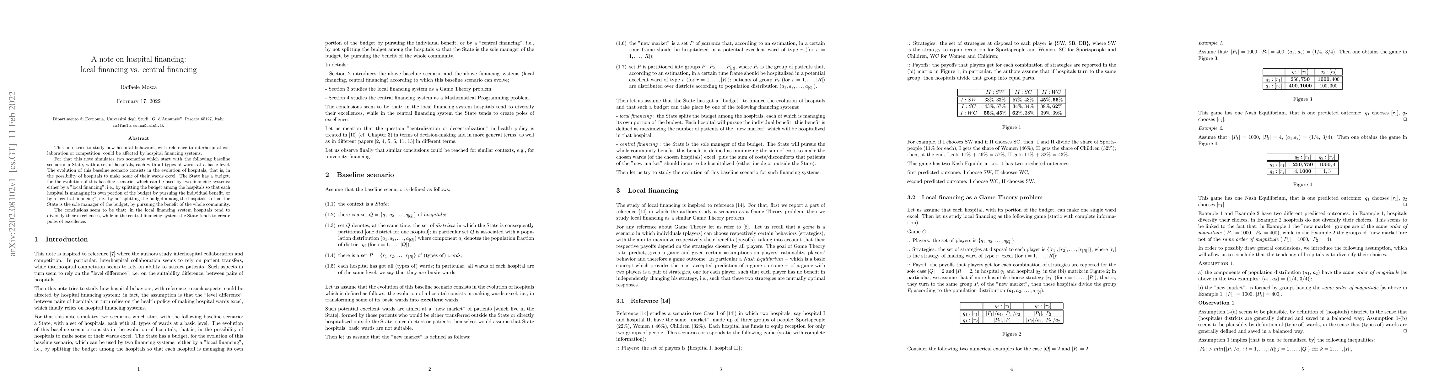 This note tries to study how hospital behaviors, with reference to interhospital collaboration or competition, could be affected by hospital financing systems. For that this note simulates two scenarios which start with the following baseline scenario: a State, with a set of hospitals, each with all types of wards at a basic level. The evolution of this baseline scenario consists in the evolution of hospitals, that is, in the possibility of hospitals to make some of their wards excel. The State has a budget, for the evolution of this baseline scenario, which can be used by two financing systems: either by a "local financing", i.e., by splitting the budget among the hospitals so that each hospital is managing its own portion of the budget by pursuing the individual benefit, or by a "central financing", i.e., by not splitting the budget among the hospitals so that the State is the sole manager of the budget, by pursuing the benefit of the whole community. The conclusions seem to be that: in the local financing system hospitals tend to diversify their excellences, while in the central financing system the State tends to create poles of excellence.