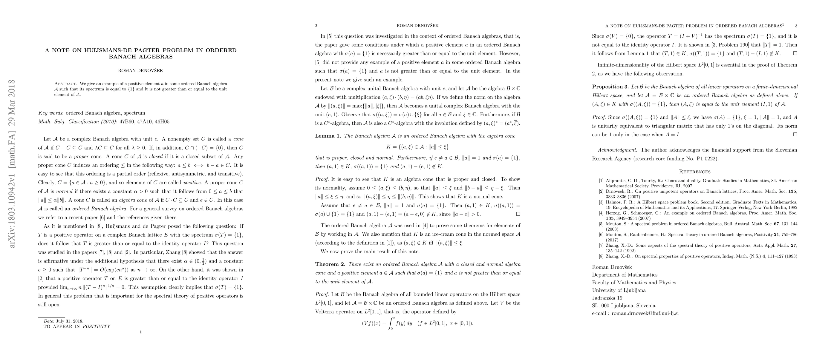 A research paper finds an example of a positive element in an ordered Banach algebra with a spectrum of {1}, challenging the assumption that such elements are greater than or equal to the unit element.