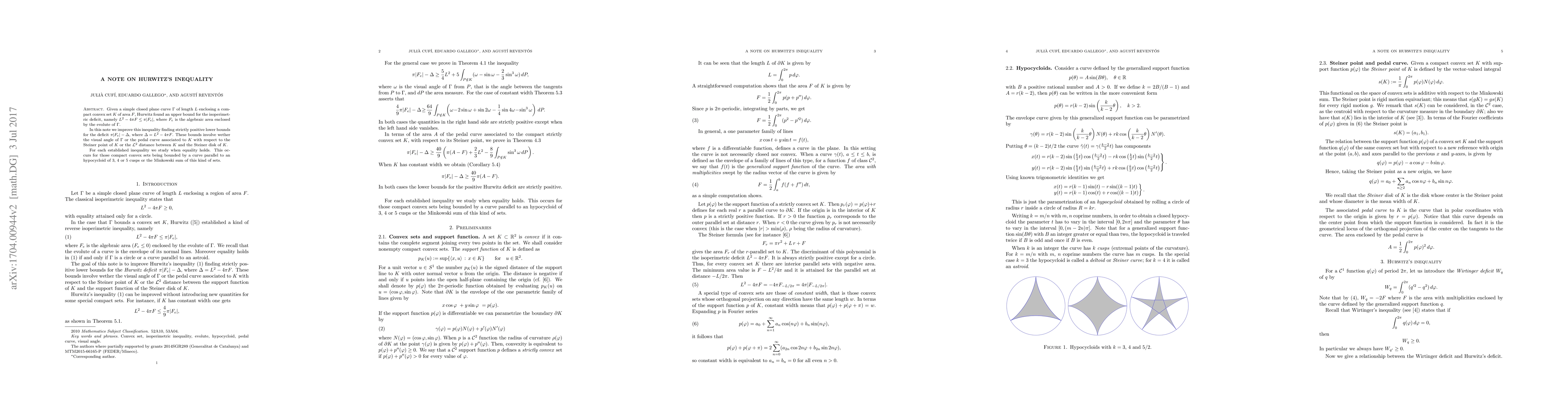 Given a simple closed plane curve $\Gamma$ of length $L$ enclosing a compact convex set $K$ of area $F$, Hurwitz found an upper bound for the isoperimetric deficit, namely $L^2-4\pi F\leq \pi |F_{e}|$, where $F_{e}$ is the algebraic area enclosed by the evolute of $\Gamma$. In this note we improve this inequality finding strictly positive lower bounds for the deficit $\pi|F_{e}|-\Delta$, where $\Delta=L^{2}-4\pi F$. These bounds involve wether the visual angle of $\Gamma$ or the pedal curve associated to $K$ with respect to the Steiner point of $K$ or the $\mathcal{L}^{2}$ distance between $K$ and the Steiner disk of $K$. For each established inequality we study when equality holds. This occurs for those compact convex sets being bounded by a curve parallel to an hypocycloid of $3, 4$ or $5$ cusps or the Minkowski sum of this kind of sets.