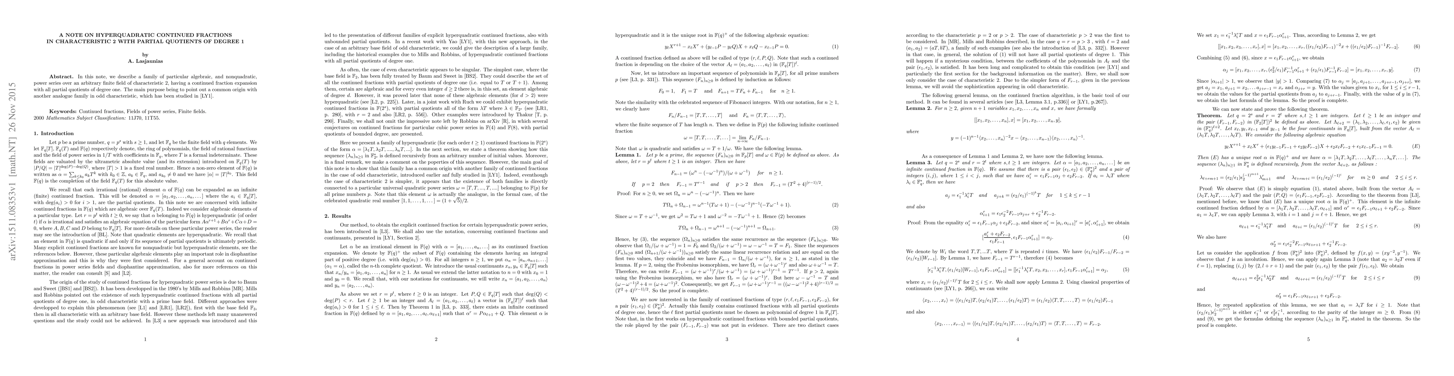 Summary: This note explores a family of algebraic power series over finite fields of characteristic 2 with continued fraction expansions featuring only degree-one partial quotients, highlighting a shared origin with a similar family in odd characteristic fields.