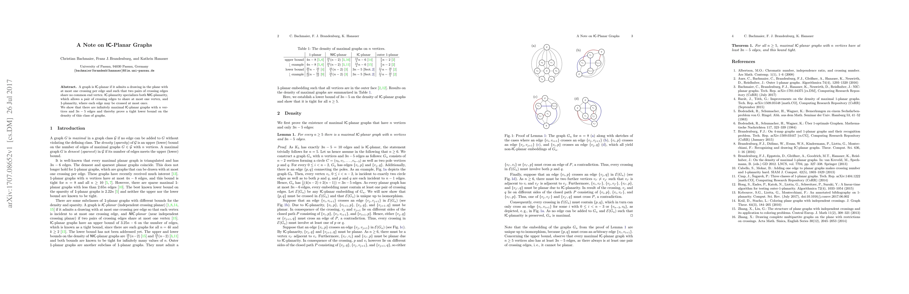 Summary: This paper introduces IC-planar graphs, a subclass of 1-planar graphs, and demonstrates that there exist infinitely many maximal IC-planar graphs, establishing a tight lower bound on their edge density.