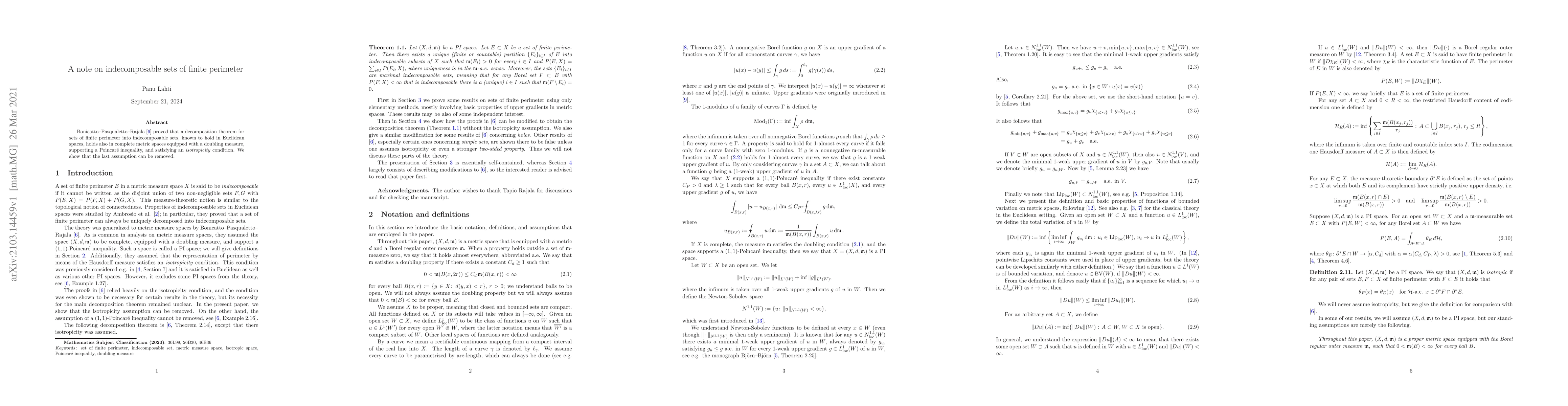 Bonicatto--Pasqualetto--Rajala (2020) proved that a decomposition theorem for sets of finite perimeter into indecomposable sets, known to hold in Euclidean spaces, holds also in complete metric spaces equipped with a doubling measure, supporting a Poincar\'e inequality, and satisfying an \emph{isotropicity} condition. We show that the last assumption can be removed.