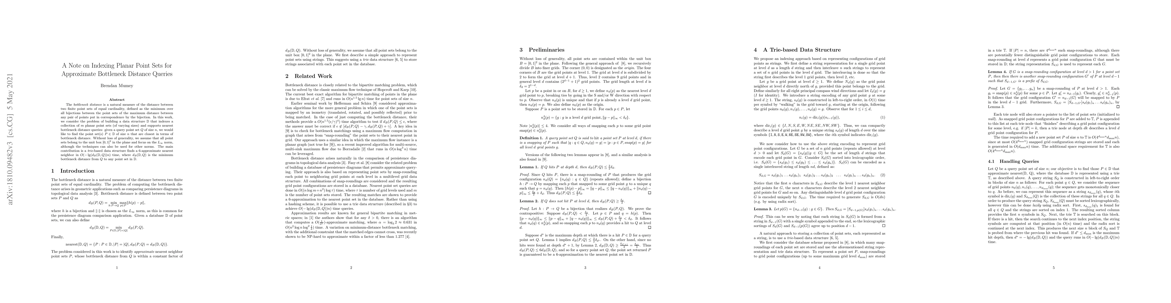This research paper introduces a data structure that indexes planar point sets to efficiently answer nearest bottleneck distance queries. It provides a 6-approximate solution in O(-log(d_B(Q,Q)) n) time, where d_B is the minimum bottleneck distance from query set Q to any indexed set.