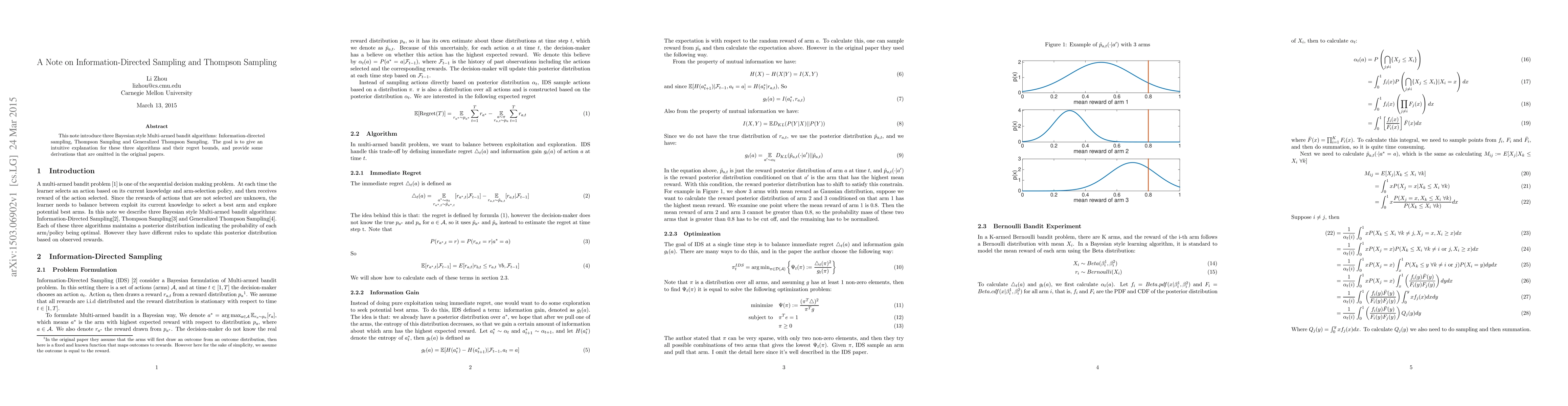 This paper presents intuitive explanations and additional derivations for three Bayesian multi-armed bandit algorithms: Information-directed sampling, Thompson Sampling, and Generalized Thompson Sampling, focusing on their regret bounds.