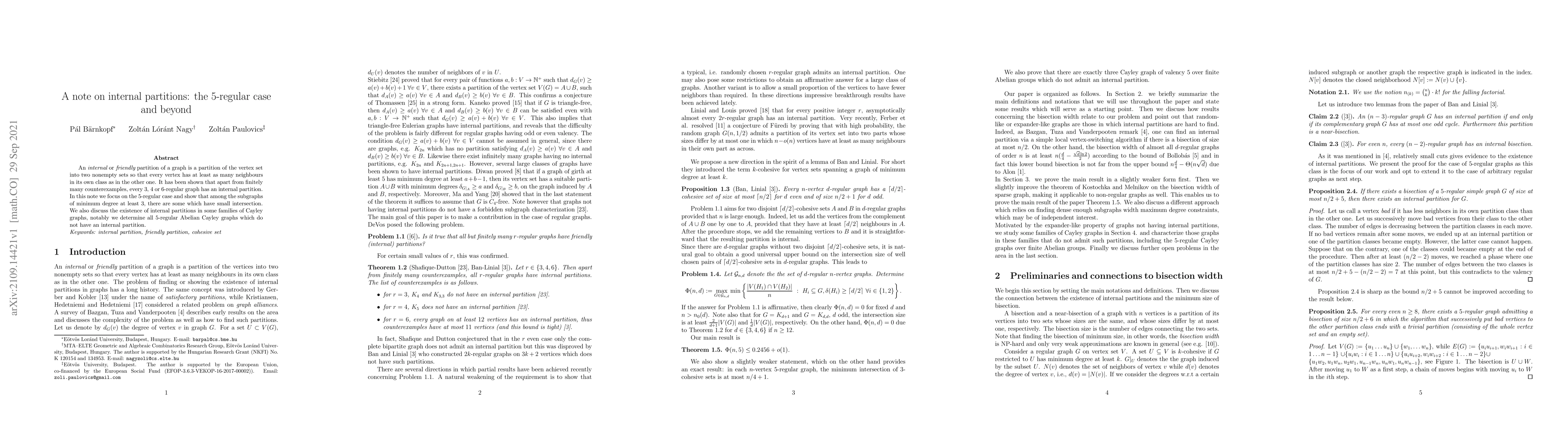 An internal or friendly partition of a graph is a partition of the vertex set into two nonempty sets so that every vertex has at least as many neighbours in its own class as in the other one. It has been shown that apart from finitely many counterexamples, every 3, 4 or 6-regular graph has an internal partition. In this note we focus on the $5$-regular case and show that among the subgraphs of minimum degree at least $3$, there are some which have small intersection. We also discuss the existence of internal partitions in some families of Cayley graphs, notably we determine all $5$-regular Abelian Cayley graphs which do not have an internal partition.