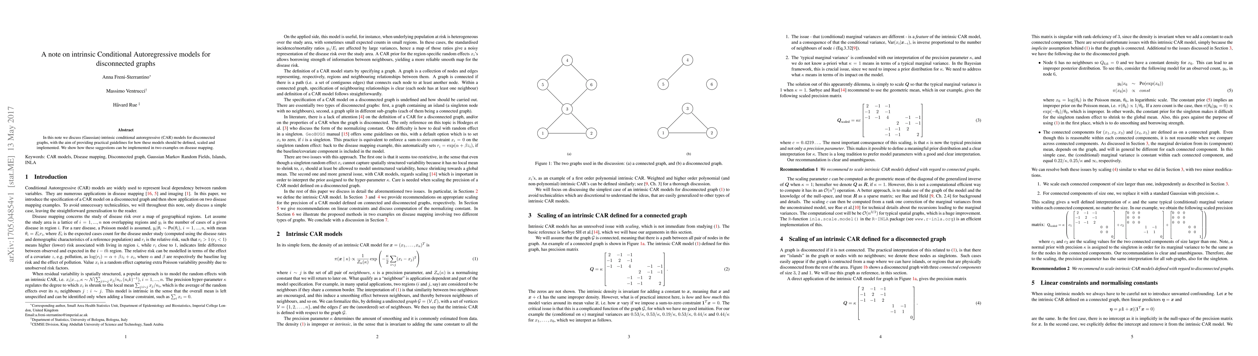 The paper discusses Gaussian intrinsic conditional autoregressive (CAR) models for disconnected graphs, providing guidelines for their definition, scaling, and implementation, with examples on disease mapping.